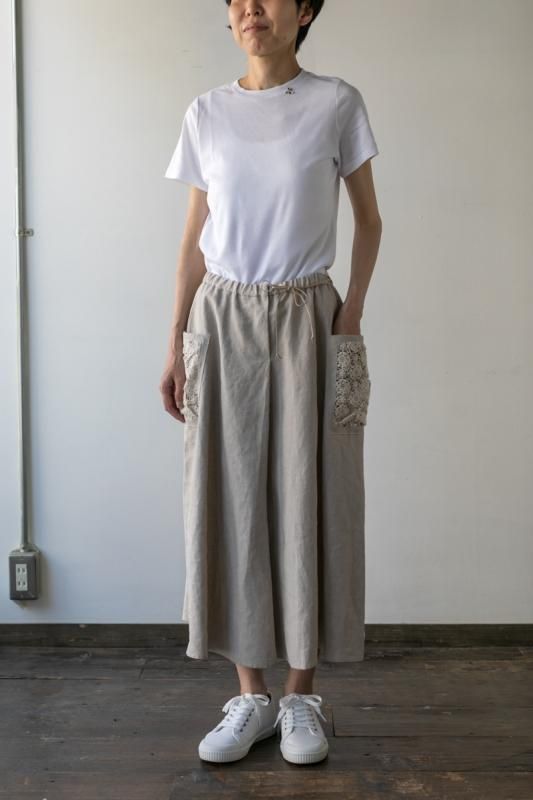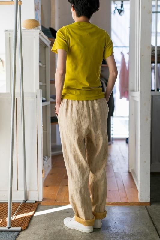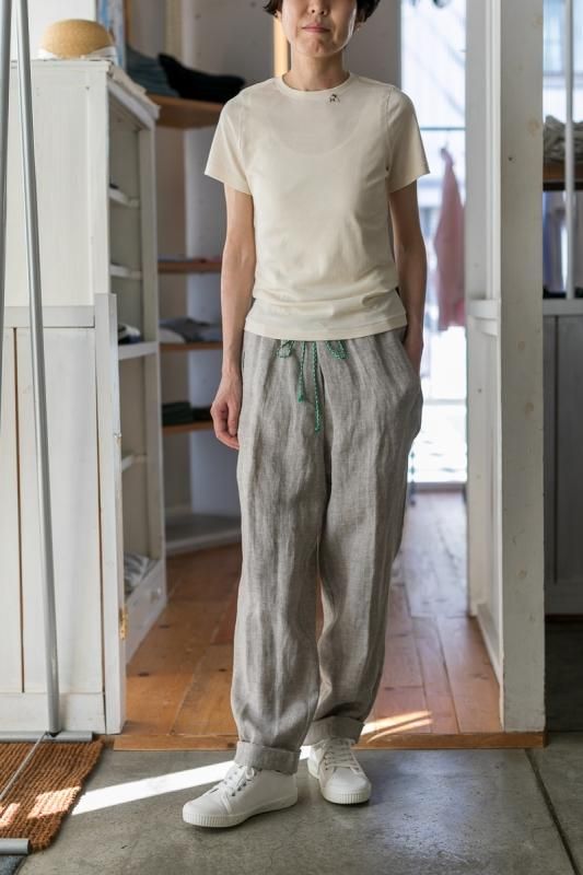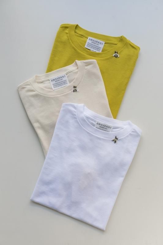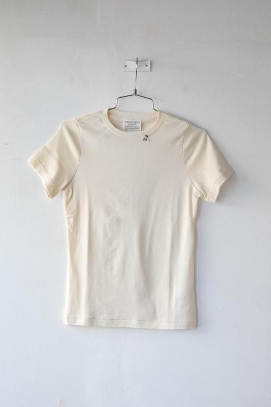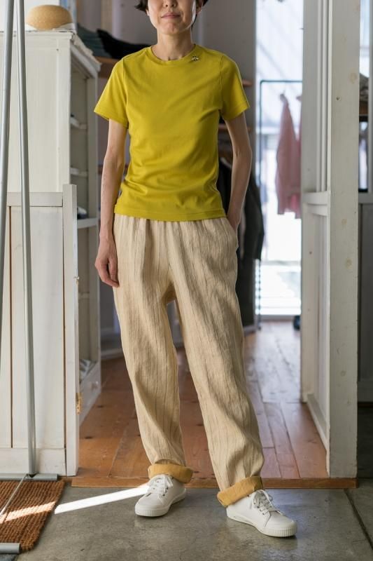 素材 綿100%(100/2 フライス) カラー アイボリー、イエロー、ホワイト サイズ 1 , 2 1サイズ 肩幅 31.5 身幅 41.5 着丈 59 袖丈 18(cm) 2サイズ 肩幅 33 身幅 43 着丈 62 袖丈 19.5(cm) *伸縮性のある素材です。伸ばさずに平置きの状態で測りました。 個体差がありますので、サイズの多少の誤差はご了承くださいませ。 細い糸で編まれたフライス生地は横に伸縮性があり、とても柔らかな肌触りで気持ちいいです。 首元の詰まった、女性らしいシルエットのTシャツです。 身長160cm イエローの1サイズ着用 *イエローはカラシがかった色目になります。 コーディネイト forte_forte /コットンリネンストライプパンツ 薄手で柔らか。肌に気持ちいいです。 首元のハチのモチーフがアクセントで付いています。 アイボリーの1サイズ コーディネイト forte_forte /リネンイージーパンツ ホワイトの1サイズ コーディネイト ANTIPAST /Woven Skirt with Lace 43,000+tax 写真上より、 イエロー(カラシがかった色目です)、アイボリー、ホワイト ※パソコンのモニター環境により、商品の色味が実物と異なって見える場合がございます。 予めご了承ください。