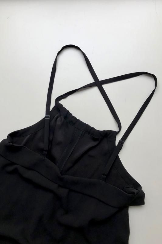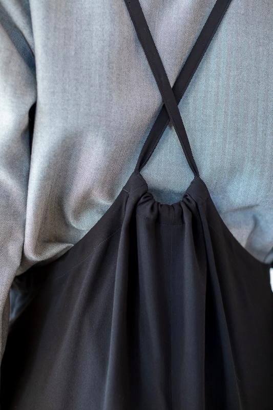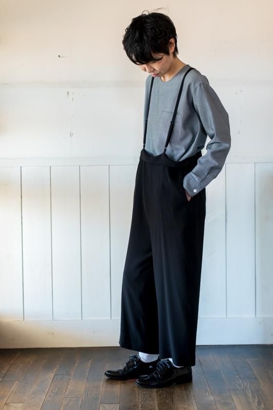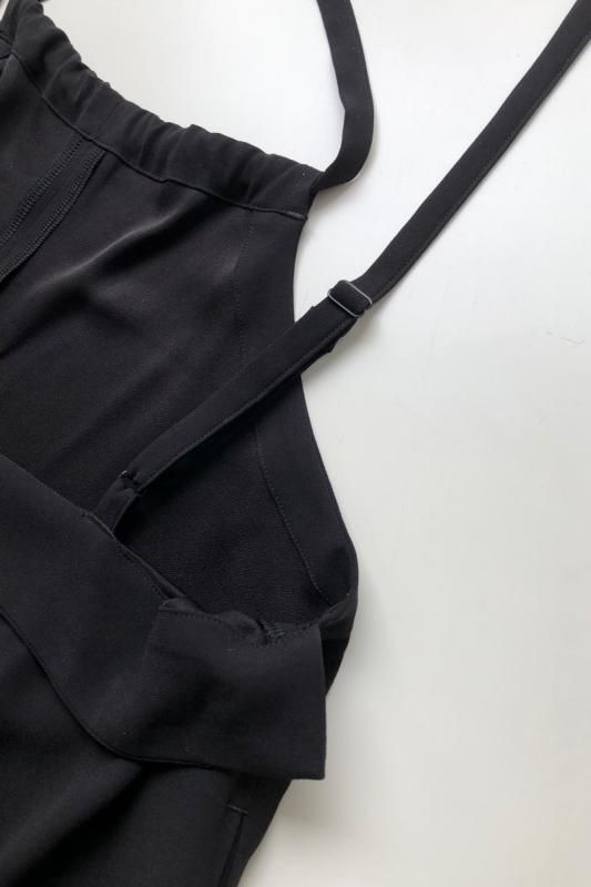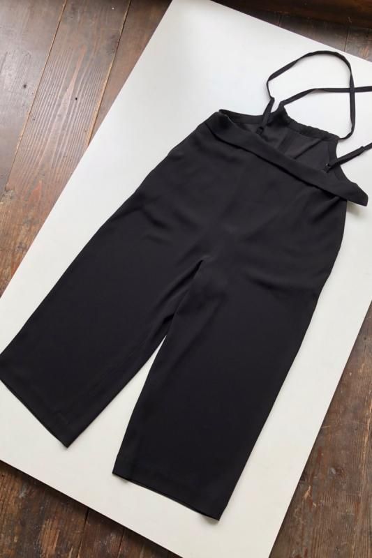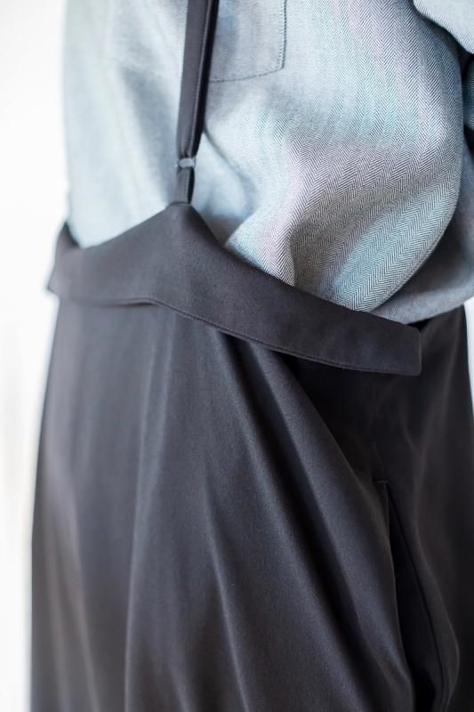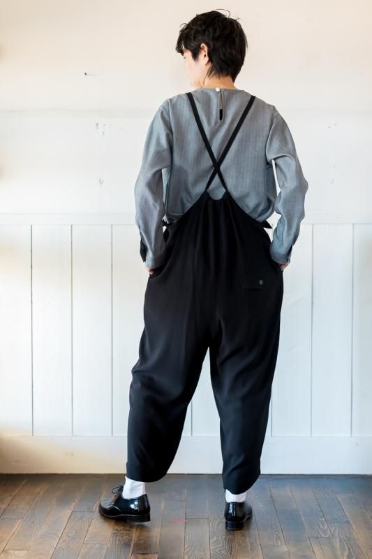 素材 トリアセテート80%、ポリエステル20% カラー ブラック サイズ 2(ワンサイズ) ウェスト 97 股上 40 股下 50.5 裾幅 26.5 わたり幅 33.5(cm) *サイズの多少の誤差はご了承くださいませ。 きれい目カジュアルにも使える、リラックス感のあるサロペットです。 横にストレッチ性があり、気持ちの良い素材で生地にとろみと落ち感があります。 身長160cm コーディネイト ゴーシュ クリアウールヘリンボン ノーカラーシャツ (グレー) 前の部分は自然に折れ曲がるデザインです。 バックスタイルも表情があります。 ヒップポケットは右にひとつ付いています。 肩ひもの取り外しはできませんが、長さは調整できます。 裏面がサテンになった生地で、薄手で裏地はついていませんが、透け感は気にせずに着用していただけます。 水洗い可能です。 *パソコンのモニター環境により、商品の色味が実物と異なって見える場合がございます。 予めご了承ください。