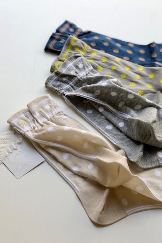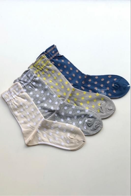 素材 綿70%、ナイロン30% カラー ブルー(モカ茶のドットとライン) グレージュ(イエローのドットとライン) アイボリー(ホワイトのドットとライン) ミックスグレー(ホワイトのドットとライン) サイズ フリー(レディス) *かかとから履き口までの高さ 約22.5cm 薄手でサラッとした肌触りのソックスは、 春夏シーズンに気持ちよく履いていただけます。 クラシックなドット柄も、アンティパストの手にかかれば、 雰囲気のある可愛らしいソックスになります。 上より ブルー(モカ茶のドットとライン) グレージュ(イエローのドットとライン) ミックスグレー(ホワイトのドットとライン) アイボリー(ホワイトのドットとライン) 後ろのラインもアクセントになります。 ※パソコンのモニター環境により、商品の色味が実物と異なって見える場合がございます。 予めご了承ください。