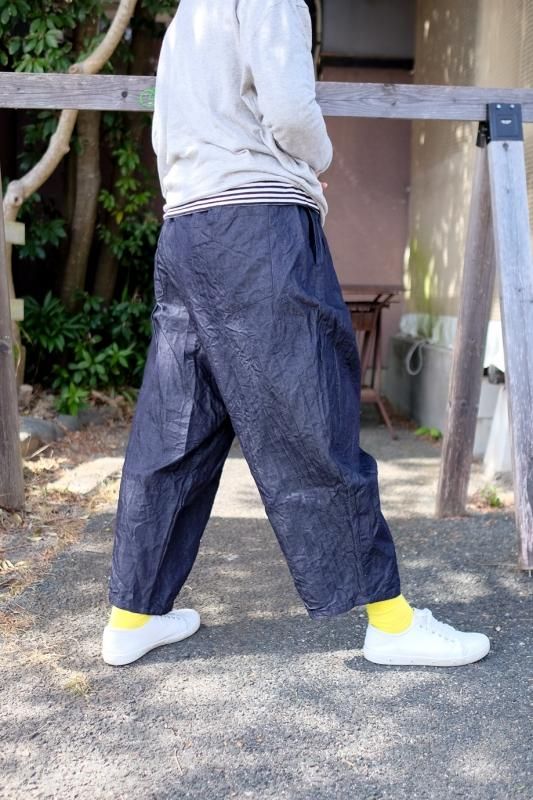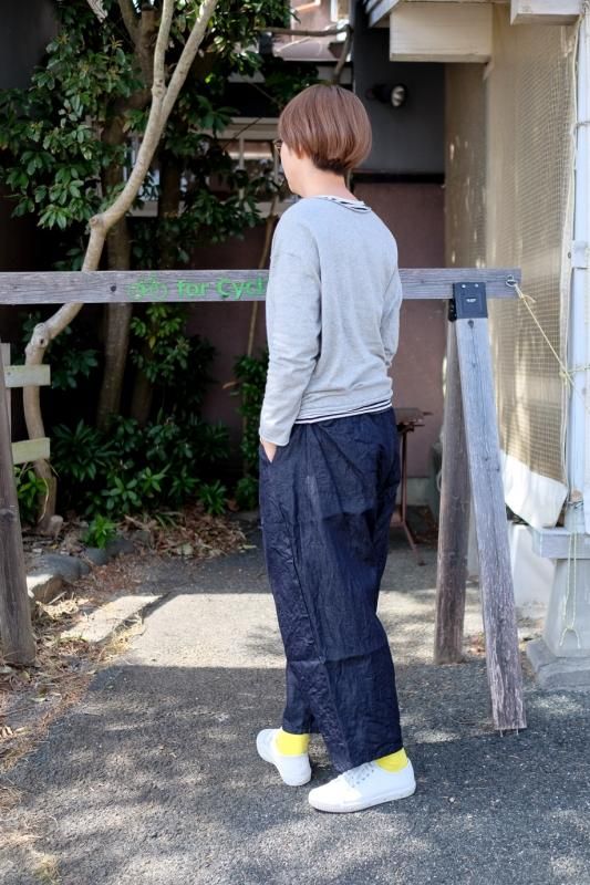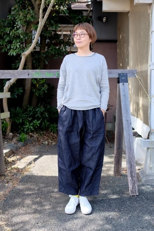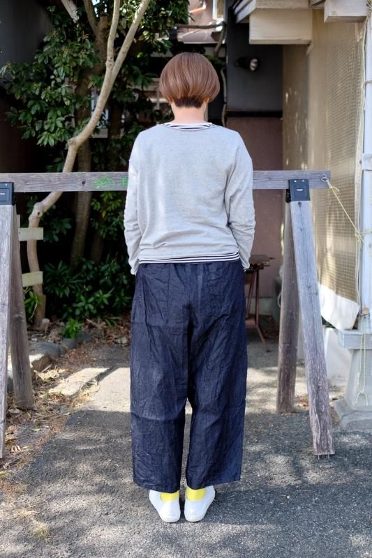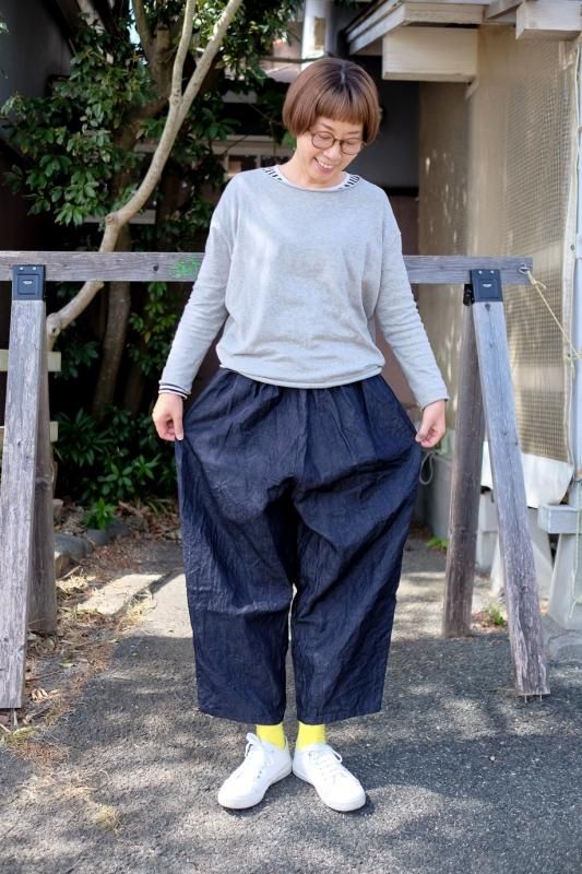 素材 コットン100% カラー インディゴ サイズ フリー ウエスト 63(ゴム+紐) 股上 51 股下 57 わたり幅 41 すそ幅 23.5(cm) トップスが薄手になるこれからの季節は、 ワイドパンツを合わせるとボリュームがでるので バランスがとりやすくおすすめです。 ライトオンスデニムを使用しているので 見た目も履き心地も軽やか。 ウエストはゴムと紐で調整できます。 自然なシワや光沢などの素材感が生きて、 シンプルなコーディネートもより魅力的になります。 身長167cm コーディネート Veritecoeur コットンニットプルオーバー spring court レザースニーカー ホワイト 股上深め、かなりワイドですが、スタイリッシュなデザイン。 両サイドにスラッシュポケット 大きめのポケットが後ろに2つ 軽くて足さばきもいいですよー。 フロント バック