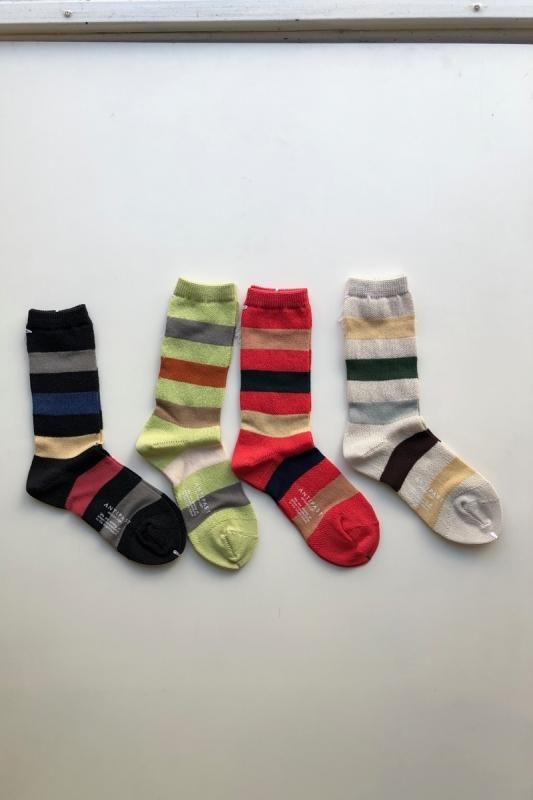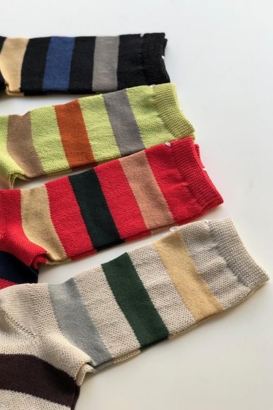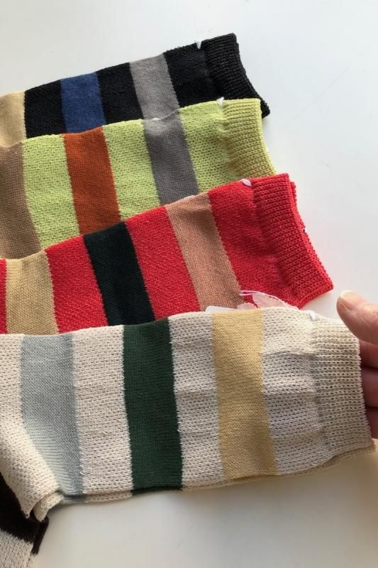 素材 ナイロン30%、綿25%、ポリエステル25%、指定外繊維(和紙)20% カラー ベージュ、ブラック、ミント、ピンク サイズ フリー(レディス) *かかとから履き口までの高さ 約22.5cm シャリ感のある涼しげなはき心地のソックス。 足元が明るくなる、楽しい配色のボーダーです。 左より ブラック、 ミント、 ピンク、 ベージュ ベースの部分は、ざっくりとした編み地です。 ※パソコンのモニター環境により、商品の色味が実物と異なって見える場合がございます。 予めご了承ください。