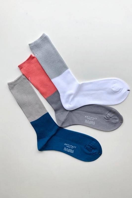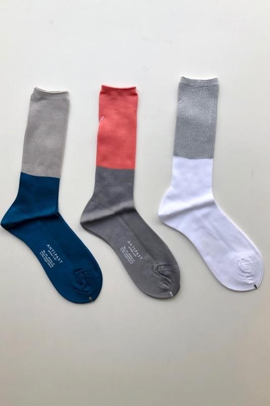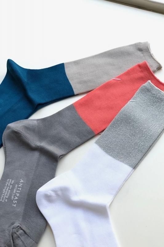 カラー ターコイズ×ライトグレー グレー×ピンク 素材 綿70%、ナイロン30% *ホワイト×シルバー ホワイト×シルバーのみ、ラメ糸を使用していますので、 混率が変わります。 素材 綿50%、ナイロン50% サイズ フリー(レディス) *かかとから履き口までの高さ 約24.5cm 色の組み合わせが楽しいソックス。 とても細かなリブ編みになります。 サラッとした肌触りが気持ち良いです。 左より ターコイズ×ライトグレー グレー×ピンク ホワイト×シルバー お好みで、三つ折りソックスのように折り曲げても履けます。 ※パソコンのモニター環境により、商品の色味が実物と異なって見える場合がございます。 予めご了承ください。