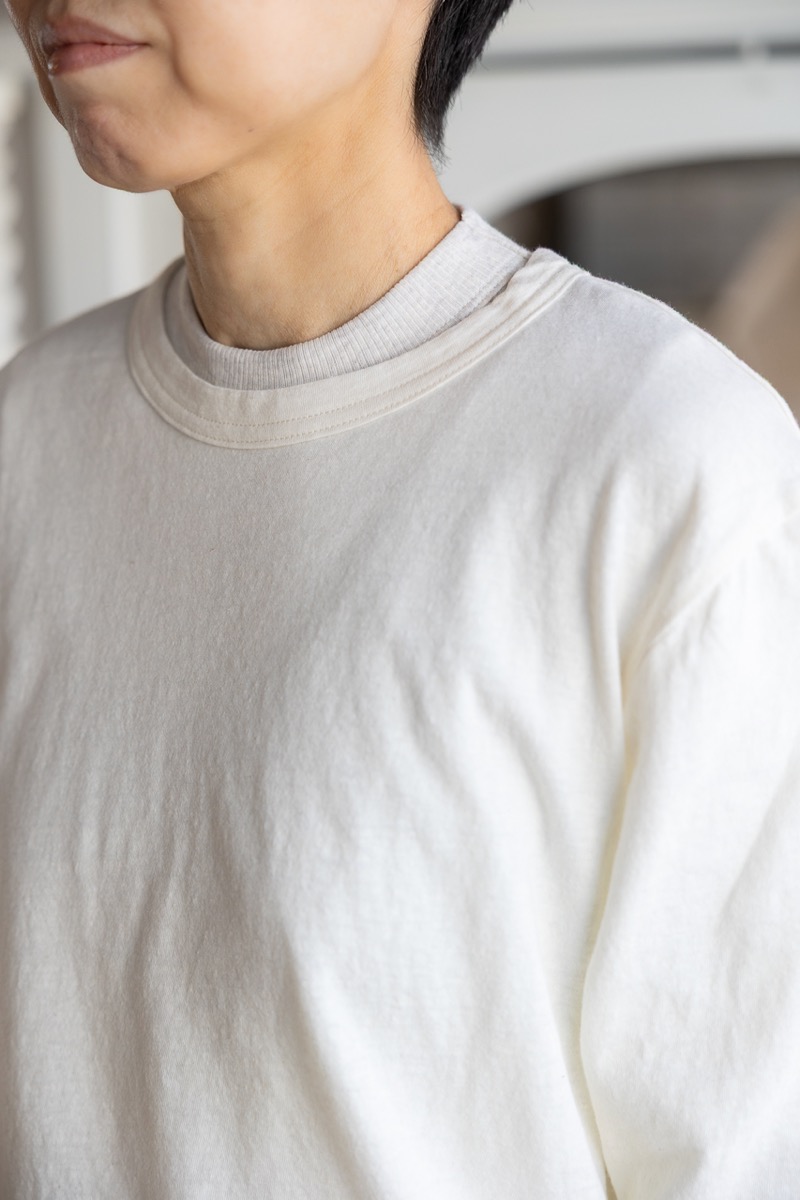 *2026年春夏分、定番のリブTシャツが再入荷しました。 カラーはタートルネックと同じ5色展開。 継続商品の為、品番が混在する場合がありますがご了承下さいませ。 * * 商品名 homspun 40/1 丸胴テレコ 長袖クルーネックプルオーバー 素材 綿100% カラー サラシ(ホワイト) オートミール ブラック TOPダークチャコール(こい杢グレー) ピンク(可愛らしい明るい色です) サイズ フリー 肩幅 29 身幅 28 着丈 64 袖丈61(cm) *とても伸縮性のある素材です。 伸ばさずに平置きした状態で計りましたのでサイズの多少の誤差はご了承くださいませ。 ホームスパン では定番のテレコ編みのカットソーです。 テレコとはリブ編みの一種で、凹凸感のある素材が特徴です。 柔らかく、伸縮性があり、フィット感にも優れていますが、締め付けず、 気持ちよく着ていただけます。 綿100%ですが思いのほか暖かく、冬のインナーから春先、秋にも、 長いシーズン重ね着に使えます。 丸胴(まるどう)という、脇に縫い目がない編み方ですので、直接肌に触れるインナーには嬉しい仕様になっています。 詰まった首元ですので、セーターのインナーなど、重ね着の季節には便利なアイテムです。 *ピンクは可愛らしい明るい色です。参考までにタートルネックと同じ色です。 こちら→→ homspunの定番素材 テレコ長袖タートルネックTシャツ *実際はもう少し明るい色味です。大変申し訳ありませんが、多少の色味の誤差はご了承下さいませ。 ピンク オートミールをインナーに重ねています。 奥より ブラック TOPダークチャコール(こい杢グレー) オートミール サラシ(ホワイト) オートミール 上より ブラック TOPダークチャコール(こい杢グレー) オートミール サラシ(ホワイト) ※パソコンのモニター環境により、商品の色味が実物と異なって見える場合がございます。 予めご了承ください