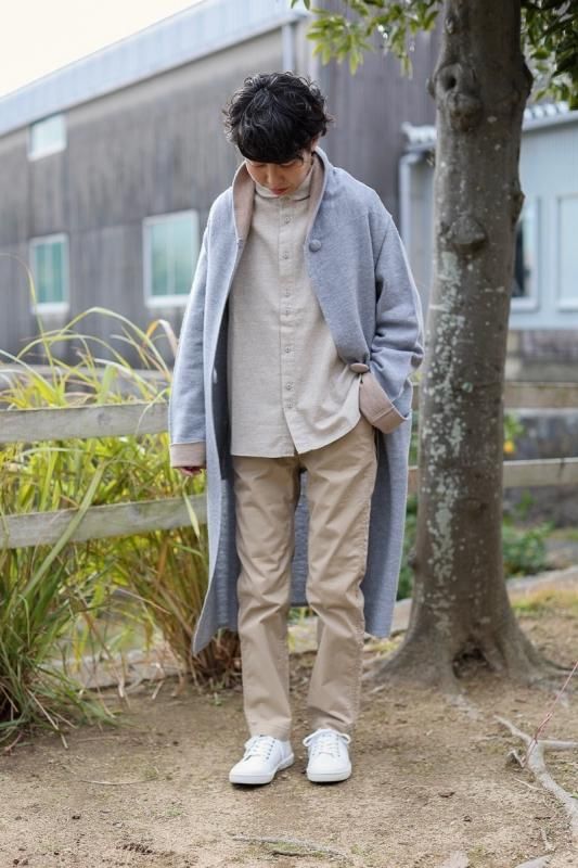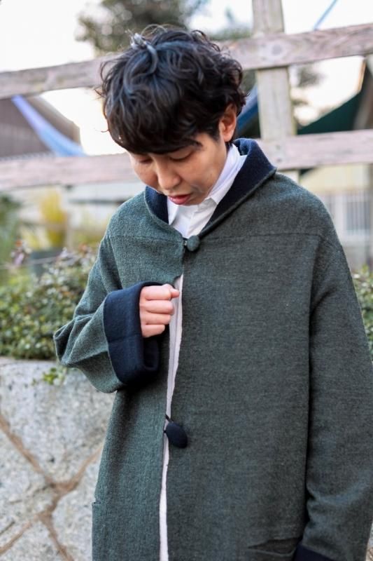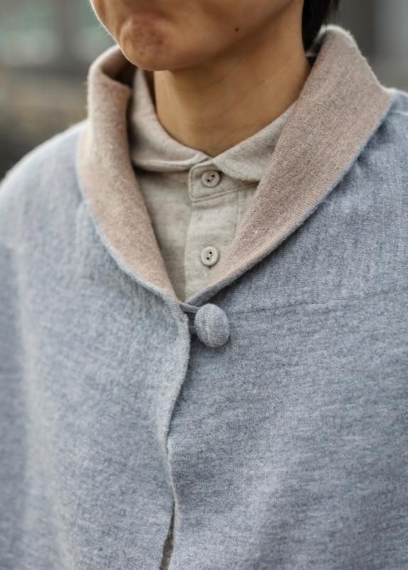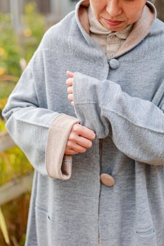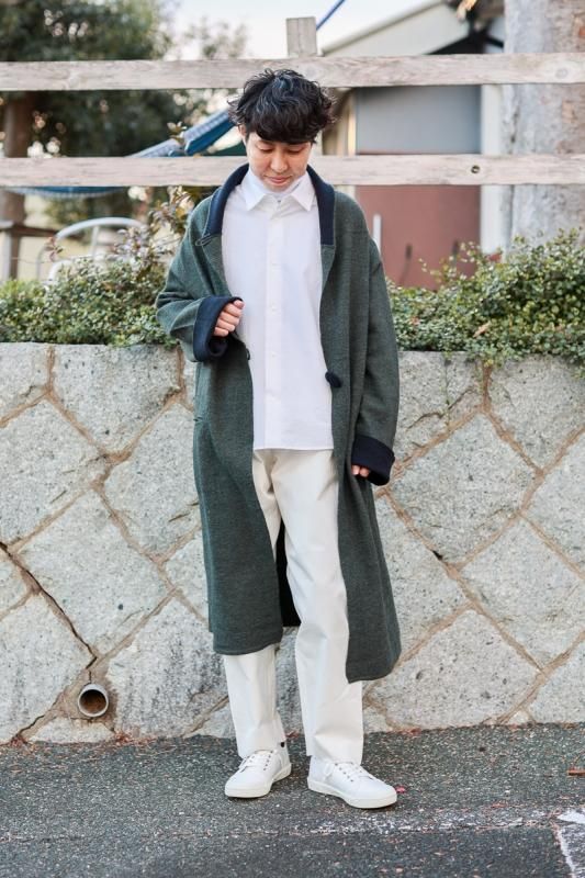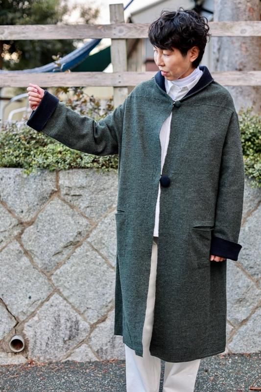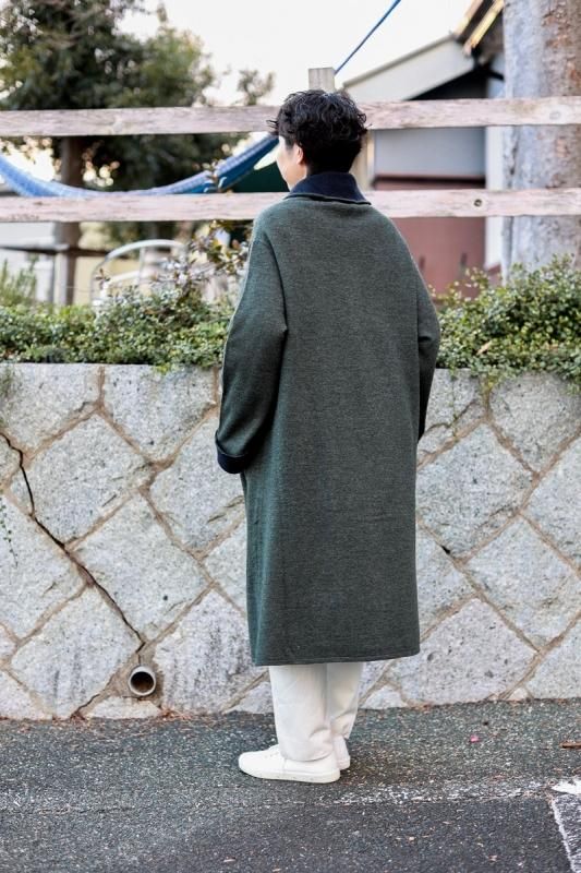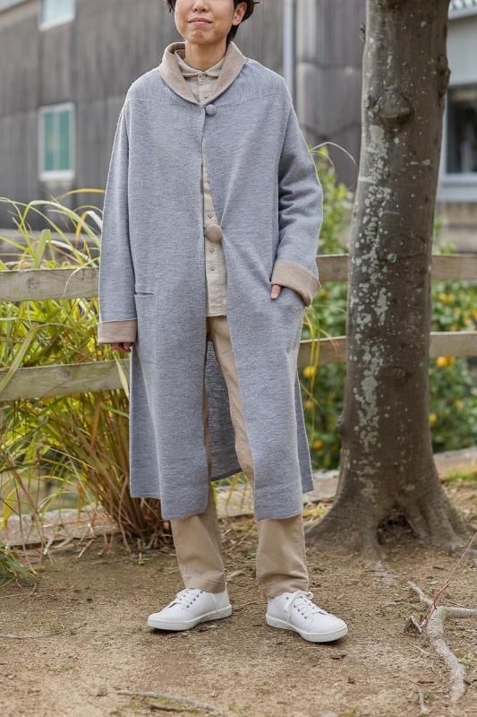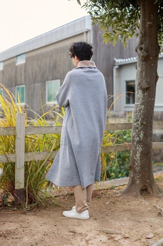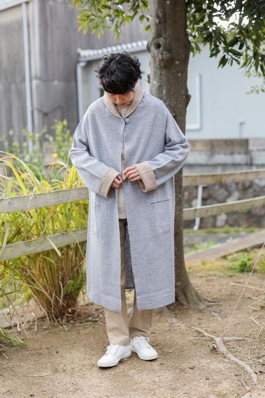 素材 毛100% カラー グレー×ベージュ(ボディがグレー、襟と袖がベージュの配色) チャコール×ネイビー (*カラー名はチャコールですが、実際のボディの色は、杢カーキに見えます。襟と袖は濃紺の配色) サイズ ワンサイズ ゆき丈 90 身幅 61 着丈 110(cm) *縮絨の為、個体差があります。サイズの多少の誤差はご了承くださいませ。 ウールに圧縮をかけることにより、フェルトのように薄手ですが、暖かみのある柔らかな生地感。 ほんの少し凹凸感のある風合いが特徴の縮絨ウール。軽い着心地のロングコート。 *ニットを縮絨させる特殊な加工を施しているため、通常のニットよりも毛の繊維が出て、毛玉になりやすくなっております。 バッグ等の摩擦にお気をつけ下さい。 ボタンは2個付いています。 ボタンを2個とも閉めて。。 身長160cm /グレー×ベージュ(ボディがグレー、襟と袖がベージュの配色) コーディネイト tannossa オーガニックツイルチノパンツ(ベージュの1サイズ) 薄手ですので、ロングカーディガンのように羽織っていただけます。 袖口は広めになります。(袖口幅約18.5cm) 折り曲げると配色が出るようになっています。 配色部分の幅はおおよそ10cm お好きな幅で折り曲げて下さい。 チャコール×ネイビー *カラー名はチャコールですが、実際のボディの色は杢カーキに見えます。襟と袖は濃紺の配色です。 濃淡が混じり合った、奥行きのある色合いです。 コーディネイト YAECA レディスコンフォートシャツ リラックスショート/ホワイト(Mサイズ) homspun 60/-フライス タートルネック プルオーバー(サラシ) YAECA レディス チノ タックテーパード(ホワイト/28サイズ) ※パソコンのモニター環境により、商品の色味が実物と異なって見える場合がございます。 予めご了承ください。