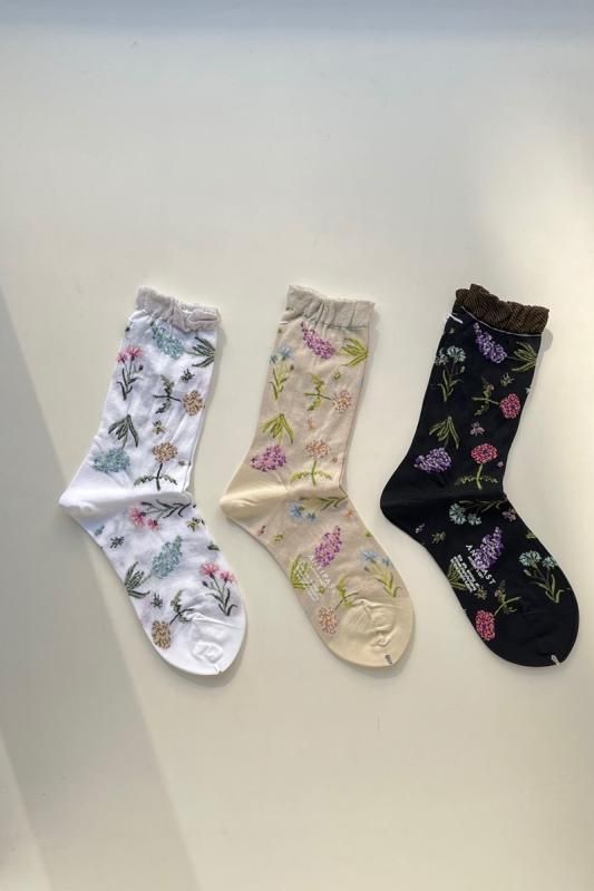素材 綿70%、ナイロン30% カラー ホワイト、アイボリー、ブラック、ブルー サイズ フリー(レディス 約23〜25cm) *かかとから履き口までの高さ約21cm *個体差がございます。 色とりどりのお花が咲いた、春らしいソックスは、 足元のおしゃれを優しくコーディネイトしてくれます。 とても薄手でさらりとした肌触りです。 向かって左より ホワイト、アイボリー、ブラック ブルー ※パソコンのモニター環境により、商品の色味が実物と異なって見える場合がございます。 予めご了承ください。