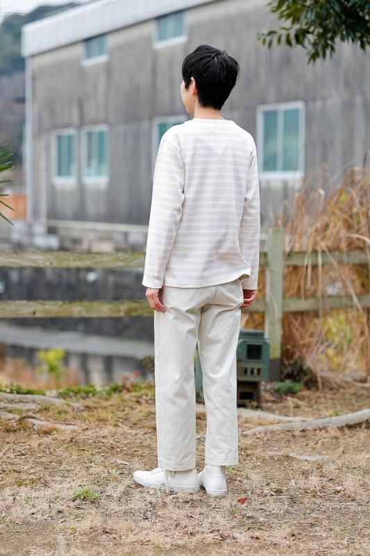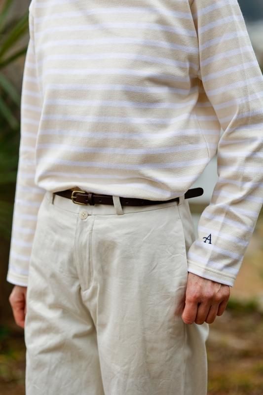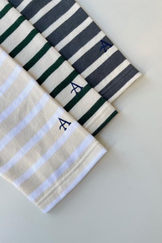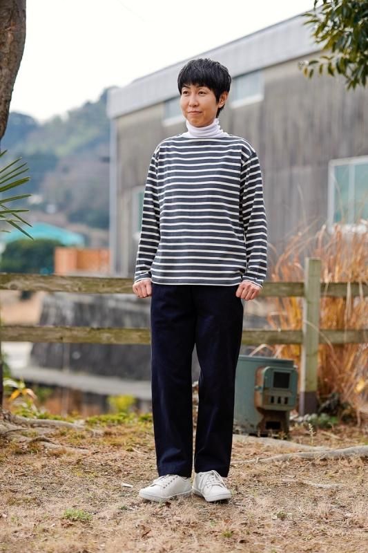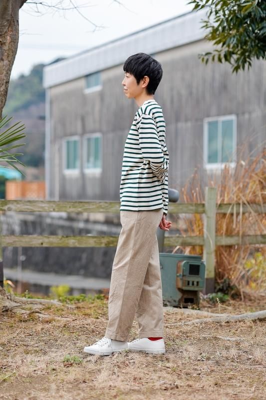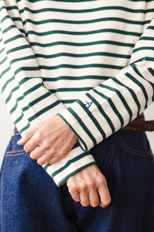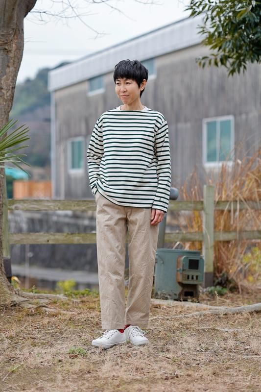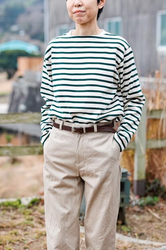 素材 綿100%(オーガニックコットン) カラー オフホワイト × グリーン(深い色のグリーン) グレー × オフホワイト オフホワイト × ホワイト サイズ 2, 3 , 4, 5 〈サイズ目安〉ユニセックス サイズ2(XS)肩幅 40:身幅 45:着丈 59:袖丈 53:袖口幅 11 : 裾幅 46(cm) サイズ3(S)肩幅 43:身幅 47.5:着丈 60:袖丈 54:袖口幅 11 : 裾幅 49 (cm) *グレーのみ袖丈51.5 サイズ4(M)肩幅 46:身幅 50.5:着丈 66:袖丈 56:袖口幅 12.5 : 裾幅 51(cm) サイズ5(L)肩幅 48:身幅 52:着丈 68:袖丈 57:袖口幅 12.5 : 裾幅 53(cm) *個体差がございます。サイズの多少の誤差はご了承くださいませ。 フランス製 アルモリュクスの特徴は、着心地にあります。 メインアイテムとなるブルトンシャツ(ボートネックボーダーシャツ)は、 オーガニックコットンやフェアトレードコットンを原料とし、 ある程度の厚みを持たせつつ、独特の柔らかさがあります。 ストレスを感じさせない快適な着心地です。 *乾燥機をかけなければ、縮みもほぼ気になりません。 (綿特有の、何度も着て洗ってを繰り返せば、少しづつの縮みはあります。) こちらで紹介するのは、さらに柔らかなオーガニックコットンになります。 オフホワイト×ホワイト グレー×オフホワイト 左袖口の「A」の刺繍がアクセント。 上より グレー × オフホワイト オフホワイト × グリーン オフホワイト × ホワイト こちらは日本別注になります。 ベーシックなフィット感を意識したサイズ設定で、 スタンダードな身幅です。 お好きなサイズ感をお選び下さいね。 身長160センチ オフホワイト × グリーン サイズ3着用 コーディネイトのベルト mononogu ウエスタンベルト コーディネイトのベルト mononogu メッシュベルト(MESH25) オフホワイト×ホワイト グレー×オフホワイト サイズ3着用 インナーのタートル homspun 60/1フライス タートルネック プルオーバー ※パソコンのモニター環境により、商品の色味が実物と異なって見える場合がございます。 予めご了承ください。