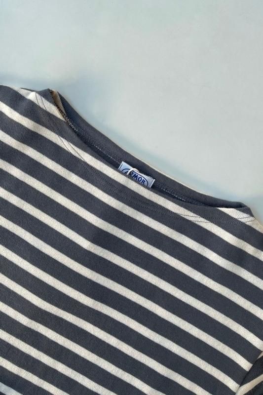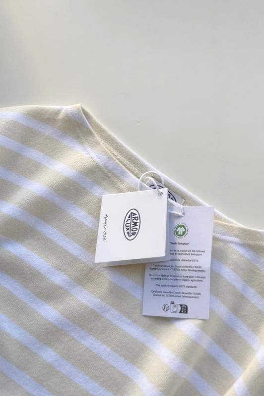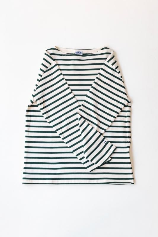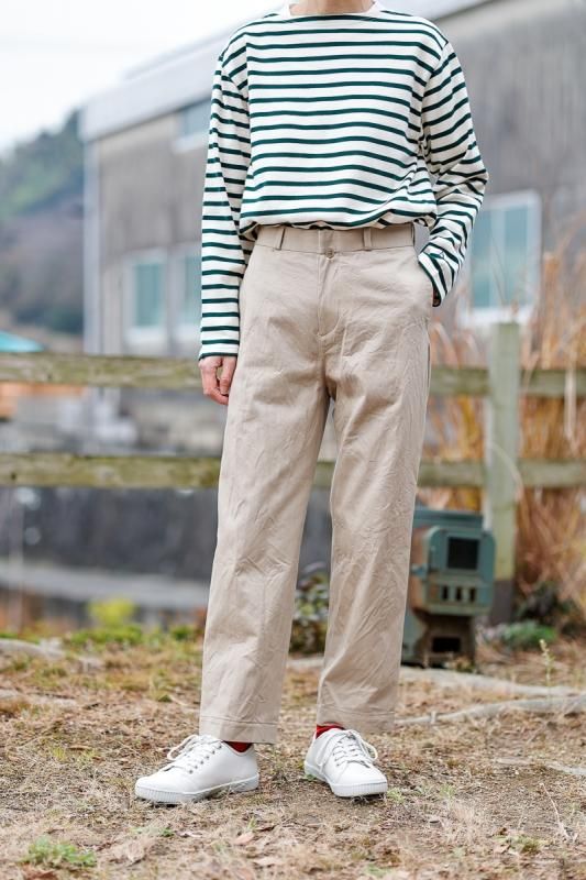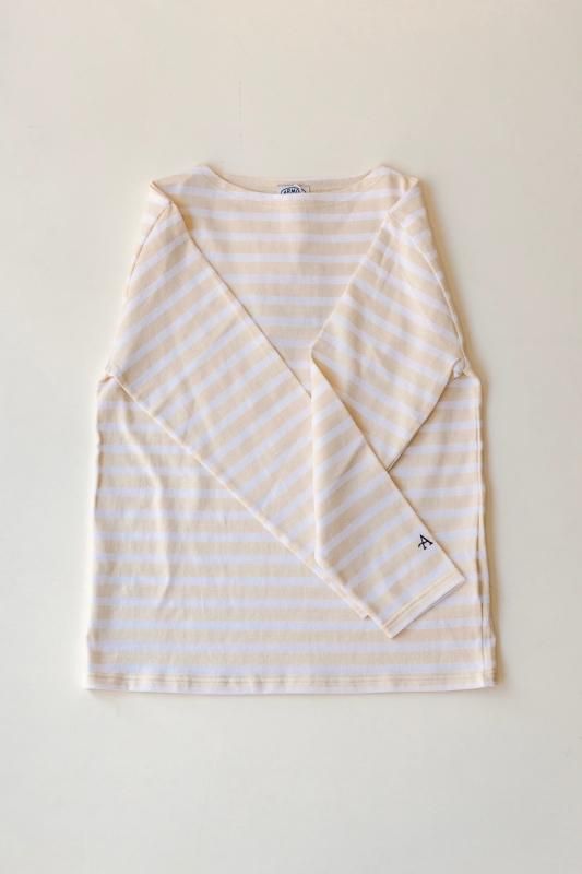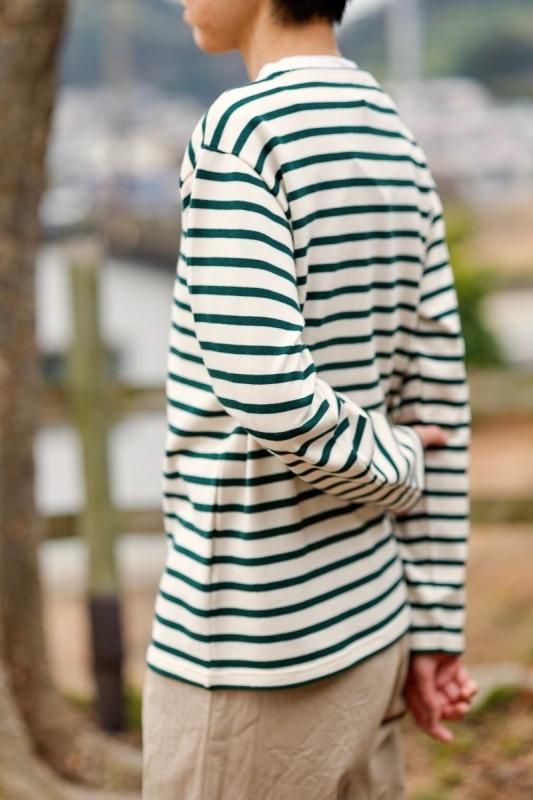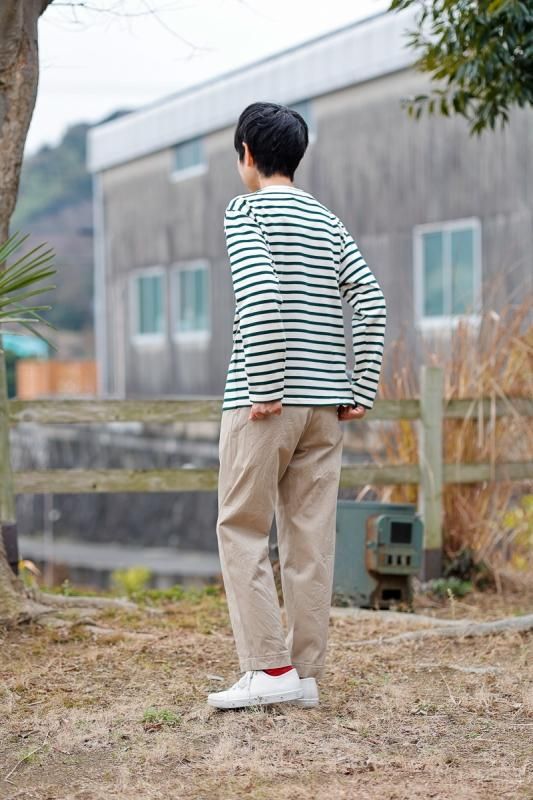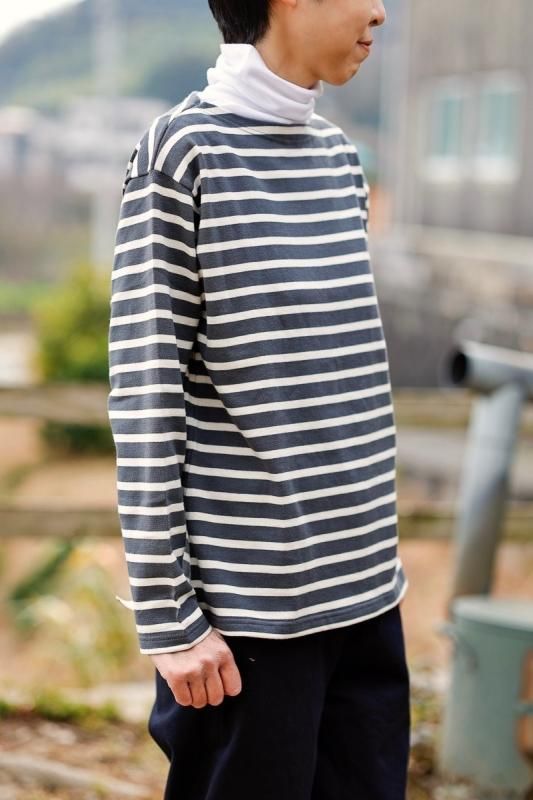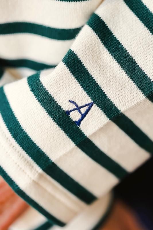 素材 綿100%(オーガニックコットン) カラー オフホワイト × グリーン(深い色のグリーン) グレー × オフホワイト オフホワイト × ホワイト サイズ 2, 3 , 4, 5 〈サイズ目安〉ユニセックス サイズ2(XS)肩幅 40:身幅 45:着丈 59:袖丈 53:袖口幅 11 : 裾幅 46(cm) サイズ3(S)肩幅 43:身幅 47.5:着丈 60:袖丈 54:袖口幅 11 : 裾幅 49 (cm) *グレーのみ袖丈51.5 サイズ4(M)肩幅 46:身幅 50.5:着丈 66:袖丈 56:袖口幅 12.5 : 裾幅 51(cm) サイズ5(L)肩幅 48:身幅 52:着丈 68:袖丈 57:袖口幅 12.5 : 裾幅 53(cm) *個体差がございます。サイズの多少の誤差はご了承くださいませ。 フランス製 アルモリュクスの特徴は、着心地にあります。 メインアイテムとなるブルトンシャツ(ボートネックボーダーシャツ)は、 オーガニックコットンやフェアトレードコットンを原料とし、 ある程度の厚みを持たせつつ、独特の柔らかさがあります。 ストレスを感じさせない快適な着心地です。 *乾燥機をかけなければ、縮みもほぼ気になりません。 (綿特有の、何度も着て洗ってを繰り返せば、少しづつの縮みはあります。) こちらで紹介するのは、さらに柔らかなオーガニックコットンになります。 オフホワイト×ホワイト グレー×オフホワイト 左袖口の「A」の刺繍がアクセント。 上より グレー × オフホワイト オフホワイト × グリーン オフホワイト × ホワイト こちらは日本別注になります。 ベーシックなフィット感を意識したサイズ設定で、 スタンダードな身幅です。 お好きなサイズ感をお選び下さいね。 身長160センチ オフホワイト × グリーン サイズ3着用 コーディネイトのベルト mononogu ウエスタンベルト コーディネイトのベルト mononogu メッシュベルト(MESH25) オフホワイト×ホワイト グレー×オフホワイト サイズ3着用 インナーのタートル homspun 60/1フライス タートルネック プルオーバー ※パソコンのモニター環境により、商品の色味が実物と異なって見える場合がございます。 予めご了承ください。