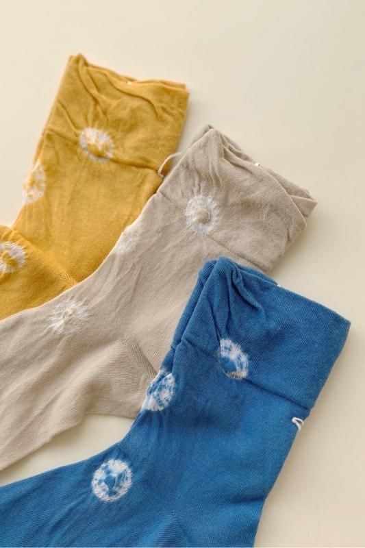 素材 綿80%、ナイロン20% カラー ブルー、グレージュ、マスタード サイズ フリー(レディス 約23〜25cm) *かかとから履き口までの高さ約16cm *個体差がございます。 薄手でさらっとした履き心地のソックスです。 この絞り染めは、職人が一つ一つ手で絞ったものを染色しております。 そのため、全く同じものは仕上がりません。 MADE IN JAPANの手仕事をお楽しみ下さい。 上より マスタード、グレージュ、ブルー ※パソコンのモニター環境により、商品の色味が実物と異なって見える場合がございます。 予めご了承ください。