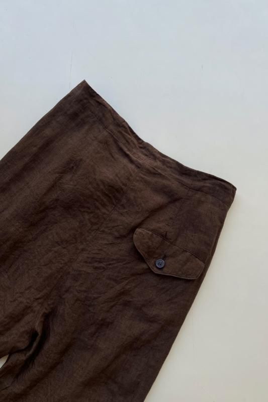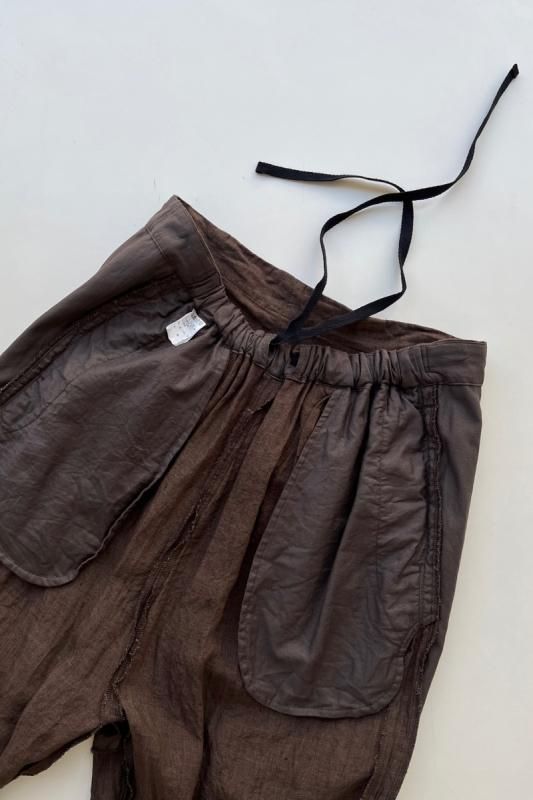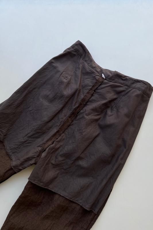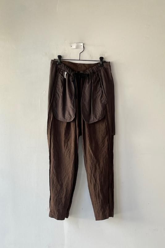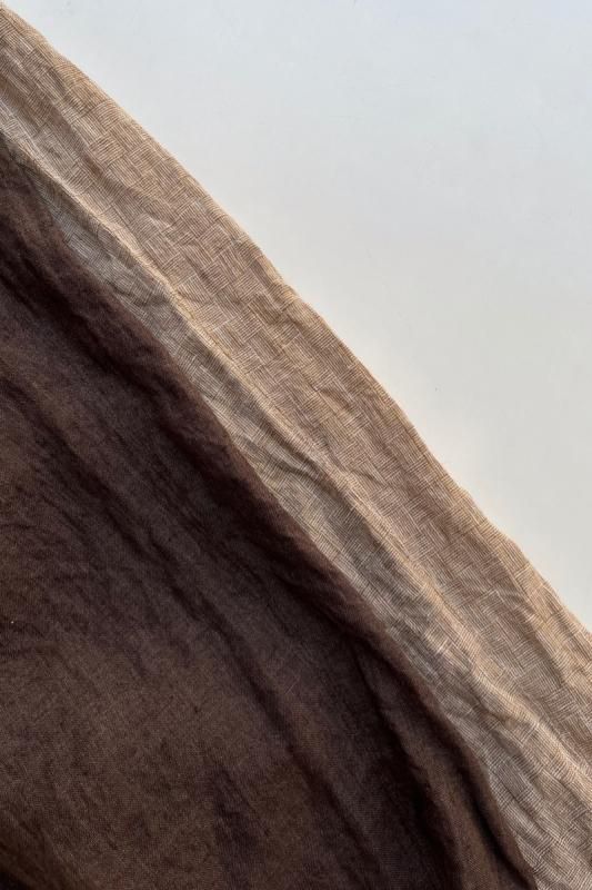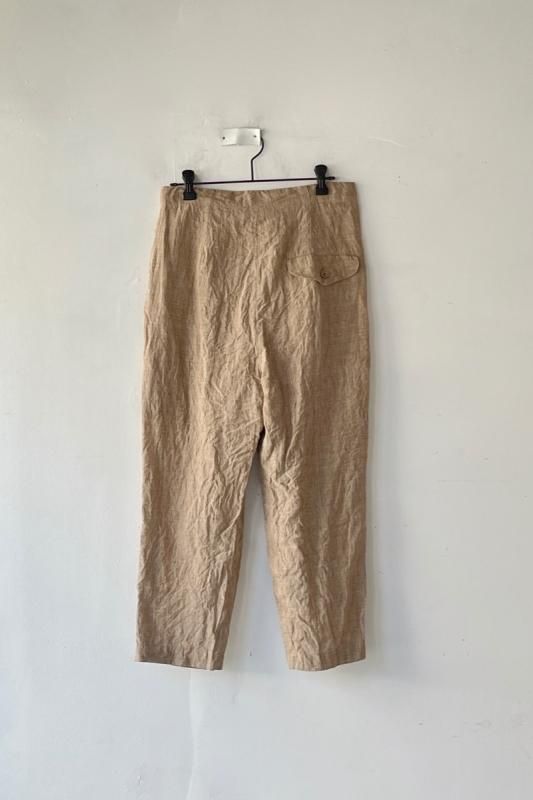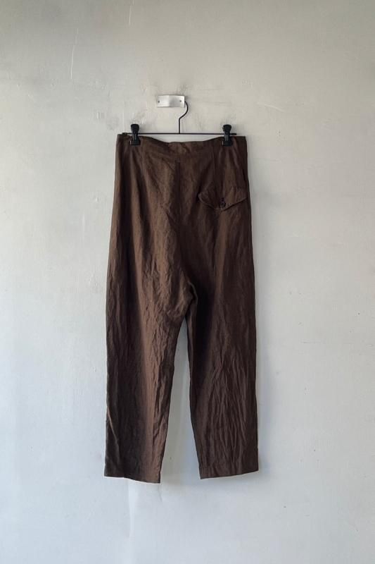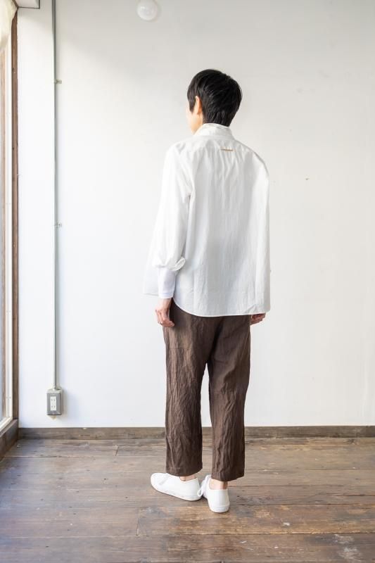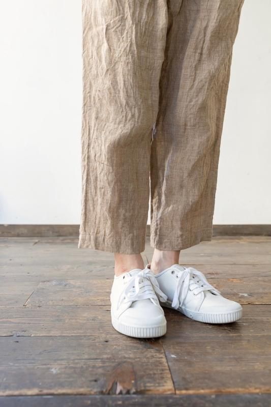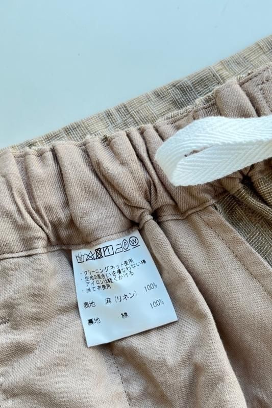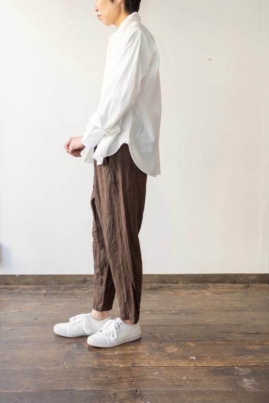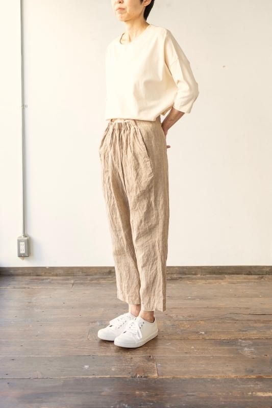 素材 表地:麻(リネン)100% 裏地:綿100% カラー ブラウン(無地) チェック柄(やや濃いめのベージュ系のブロックチェック) サイズ 2 (ワンサイズ) ウェスト 64センチ〜80センチ 股上 37 股下 51 裾幅 17.5 わたり幅 30(cm) *ウエストはゴムと紐の仕様です。 *サイズの多少の誤差はご了承くださいませ。 軽やかに履いていただける新型のゴーシュのパンツです。 表地は、糸染めした清涼感のある素朴な風合いのリネン素材。 今シーズンのノースリーブワンピースと、フレアーギャザースカートと同じ素材になります。 *製品染め加工を施してあるため、洗いざらしのシワ感も雰囲気があります。 (一点一点に多少の歪みやシワの入りに個体差があります。予めご了承下さい。) 所々に、糸ムラやネップ感が見られますが、麻の雰囲気のひとつとしていただけたらと思います。 写真左*ブラウンは、たてよこ糸を全て同色に揃えた無地になります。 写真右*チェック柄は、生成りとライトブラウンの糸を使用した、ブロックチェック柄になります。 (やや濃いめのベージュ系のチェックに見えます。) 前にギャザーとタックが入って楽なはき心地。後ろはスッキリしたデザインですので、 少し前下がりで履いていただくイメージになります。 丈は8分丈で、股上は深いです。 前ウエストのみにゴムと、内側に紐が入ります。 裾に向かってやや細くなるテーパードシルエットになります。 身長160センチ ブロックチェック柄着用 コーディネイト 7分袖ドロップショルダーTシャツ(エクリュ) ブロックチェック柄 *裏です。 裏地は、ゴワツキのない綿の裏地が後ろ身頃に付いていますので、 ヒップ周りの透け感を気にせずに履いていただけます。 ブラウン(無地) *裏です。 ブラウン(無地)着用 コーディネイト YAECA WRITE ボタンシャツ(ホワイト) ※パソコンのモニター環境により、商品の色味が実物と異なって見える場合がございます。 予めご了承ください。
