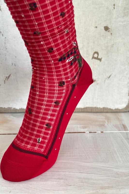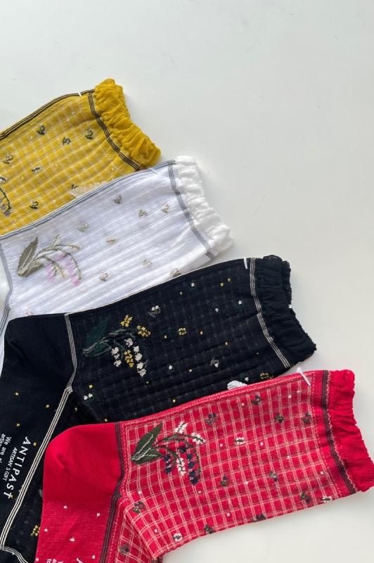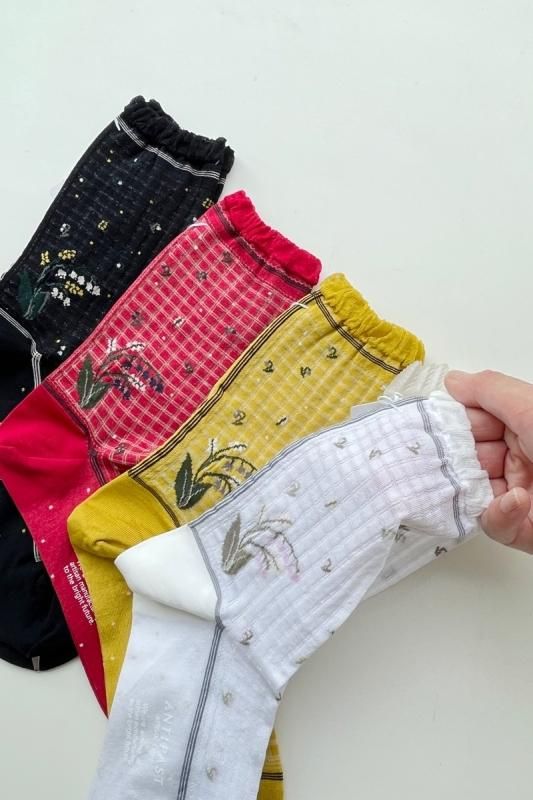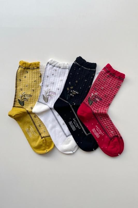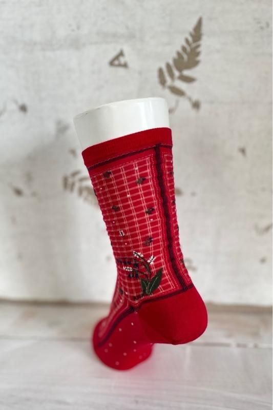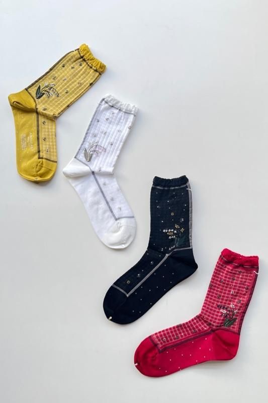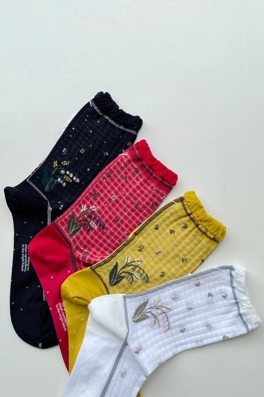 素材 綿70%、ナイロン30% カラー ホワイト レッド イエロー(カラシに近い色味です) ブラック サイズ フリー(レディス 約23〜25cm) *かかとから履き口までの高さ約19.5cm *個体差がございます。 スズランと格子柄を施したソックス。 薄手で滑らかな肌触りです。 格子柄の部分は透かし模様になっています。 ほんのりラメの光沢感もあり、小さなソックスの中に可愛いが詰まっています。 上より イエロー(カラシに近い色味です) ホワイト ブラック レッド レッド ※パソコンのモニター環境により、商品の色味が実物と異なって見える場合がございます。 予めご了承ください。