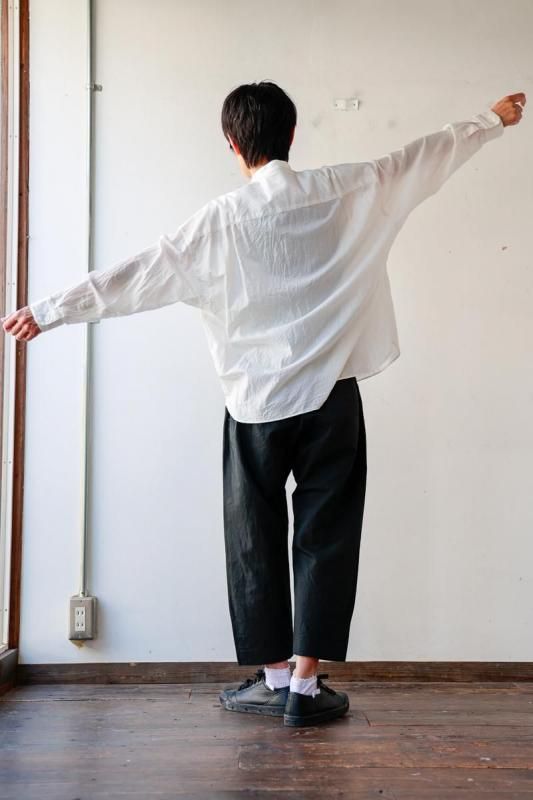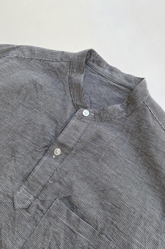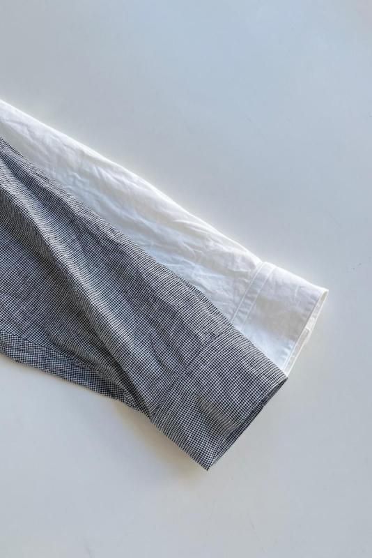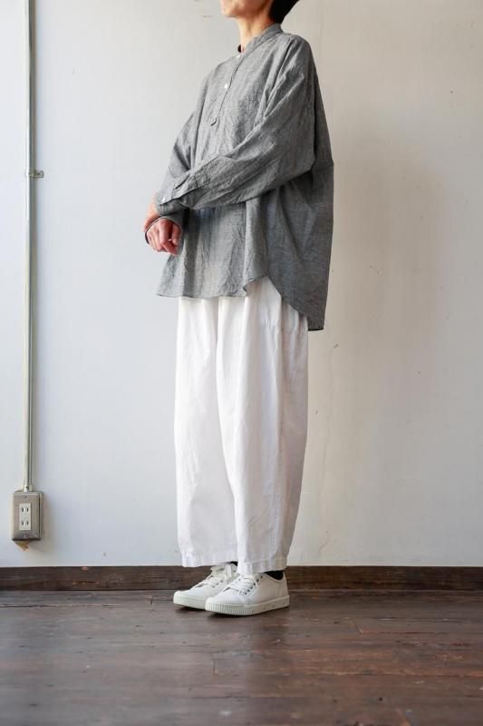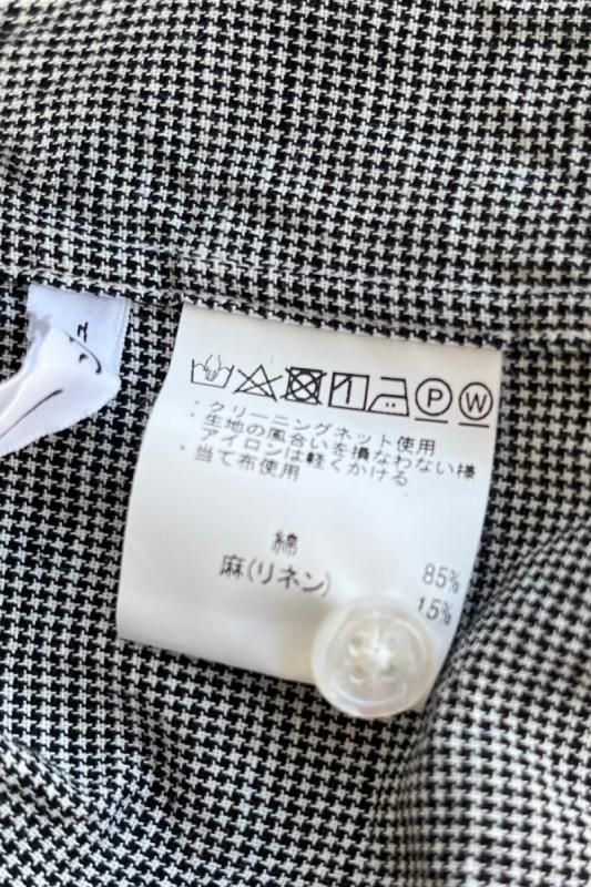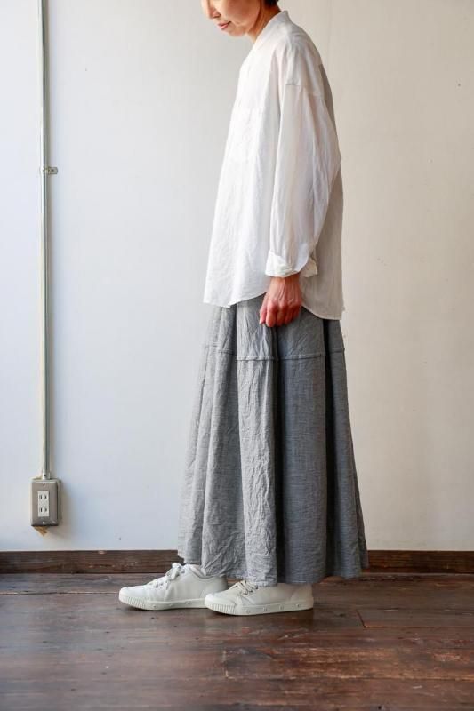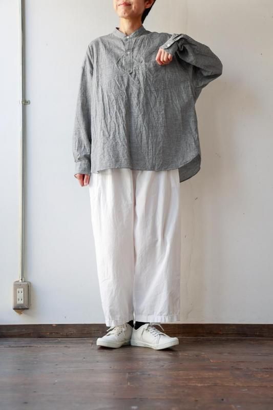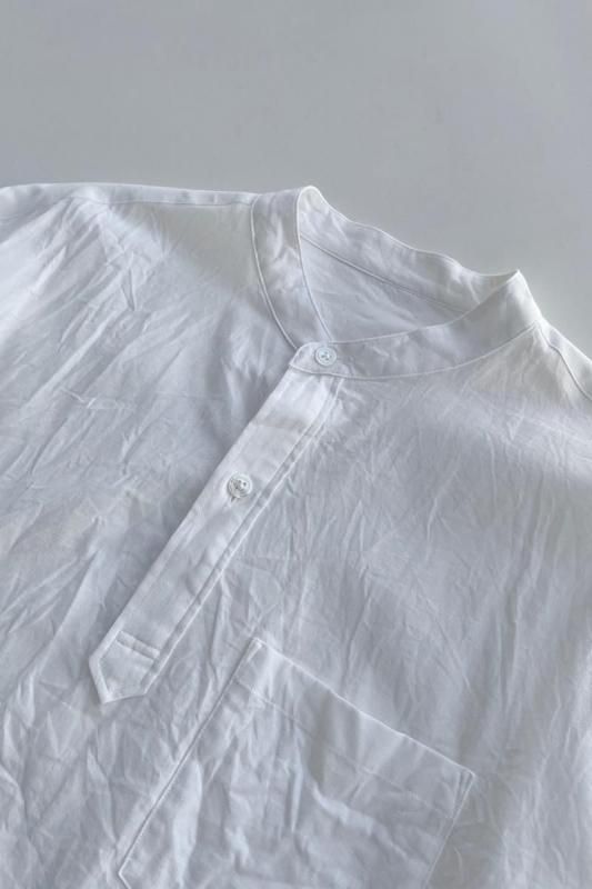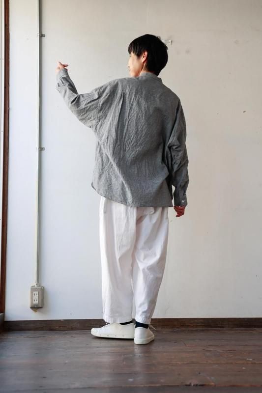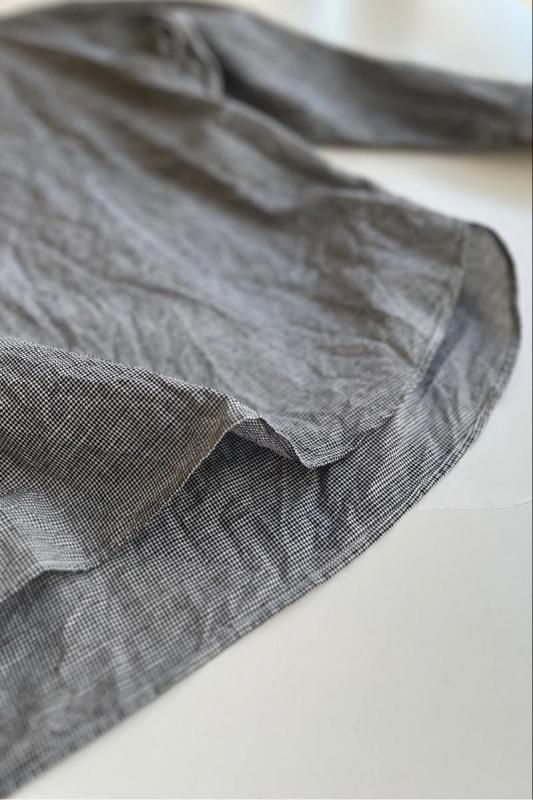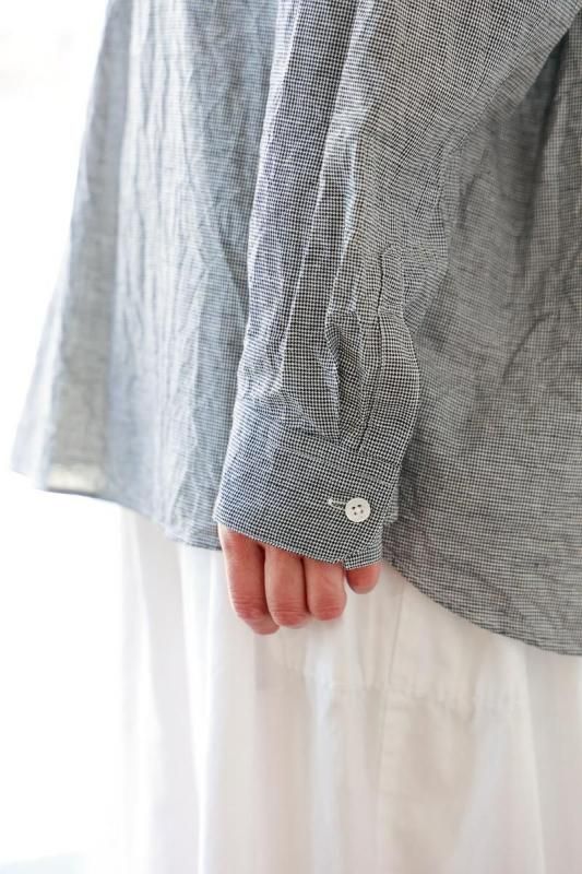 商品名 ゴーシュ コットンリネンガーゼ スタンドカラーシャツ 素材 綿85%、麻(リネン)15% カラー 千鳥柄、ホワイト サイズ 2 (ワンサイズ) 肩幅 58.5 身幅 62 着丈 ホワイト:前67、後ろ71 /千鳥柄:前69.5、後ろ72.5 袖丈 48.5(cm) *個体差があります。サイズの多少の誤差はご了承くださいませ。 2025年秋冬。ゴーシュの新作シャツです。 すぐに着られるサラサラした素材。 新型のスタンドカラーシャツは、 ふわっと着ていただく、ゆるいシルエットになります。 いつもと違う雰囲気で、太めのパンツで ゆるっとしたコーディネイトもおすすめです。 身長160センチ 薄手のコットンリネン生地になります。 柔らかさの中に、ほんのり麻のサラッとした手触りを感じられる、 ナチュラルな風合いです。 *製品洗い加工が施してありますので、洗いざらしの強めのシワ感があります。 自然な風合いをお楽しみ下さい。 一点一点に多少の歪みやシワ感、サイズの個体差があります。予めご了承下さい。 リネン混の生地に季節は関係ないそうです。 リネンには熱を保つ効果があり、混紡する素材や厚みによっては、秋冬も活躍する生地になるのです。 長いシーズン使える便利な素材ですね。 袖丈はやや長め。 袖口はカフスのデザインですので、 お好みでロールアップして下さいね。 ホワイトの方が透け感が多めです。 ホワイトは、麻のムラ糸感があり、薄い点々のようなものがみられます。 風合いのひとつとしていただければと思います。 *インナーに黒のタンクトップ着用 ボトムをスカートに変えてみました。 ※パソコンのモニター環境により、商品の色味が実物と異なって見える場合がございます。 予めご了承ください。