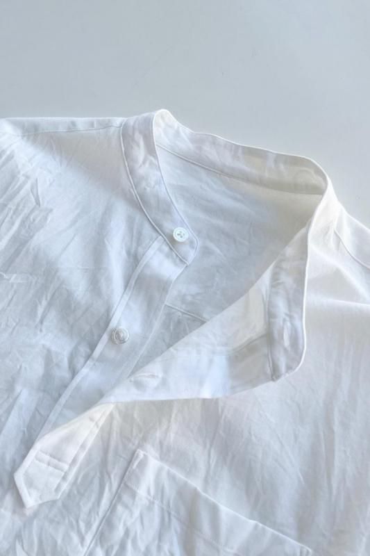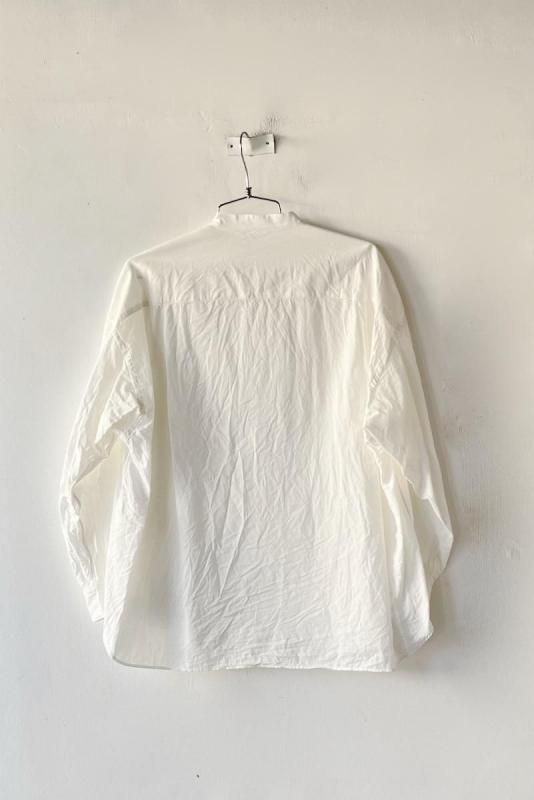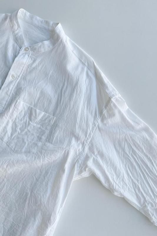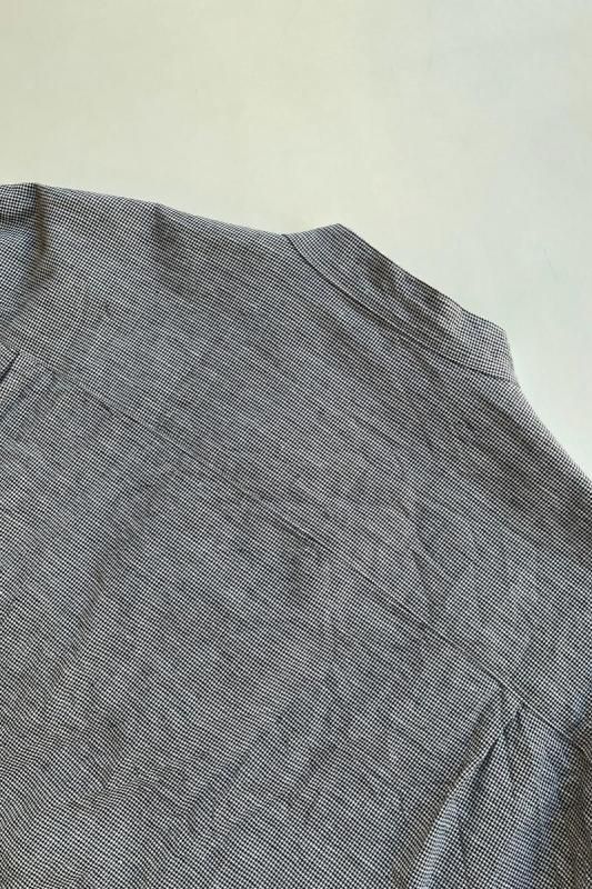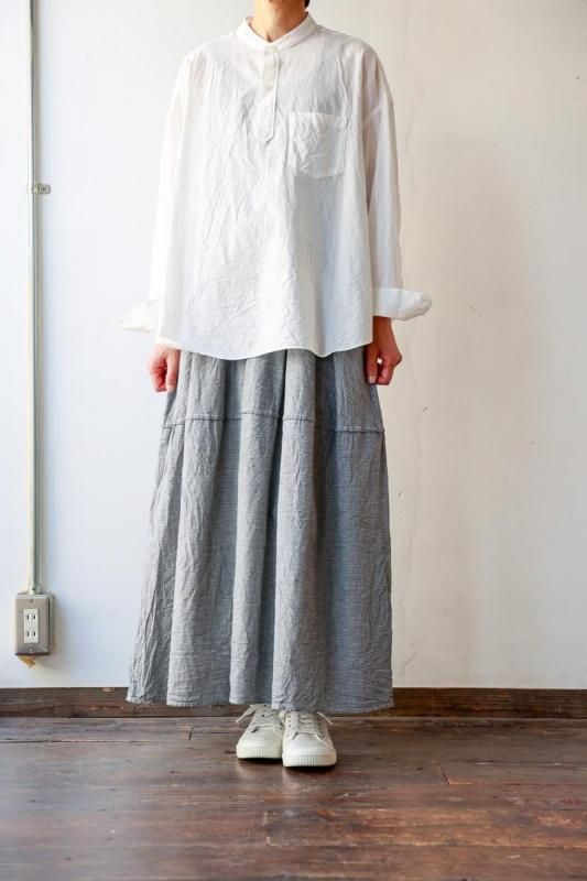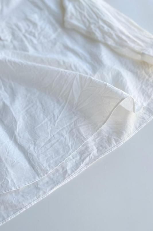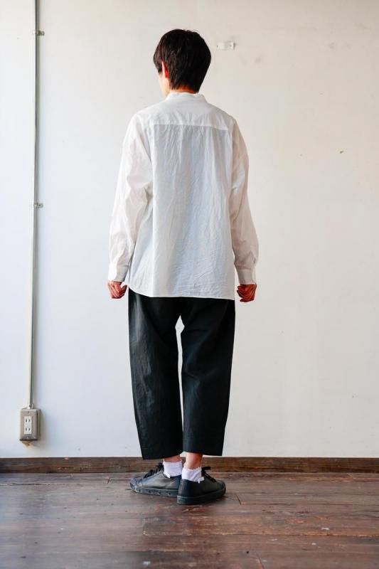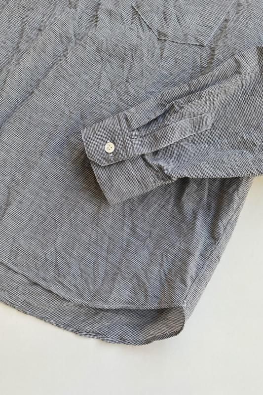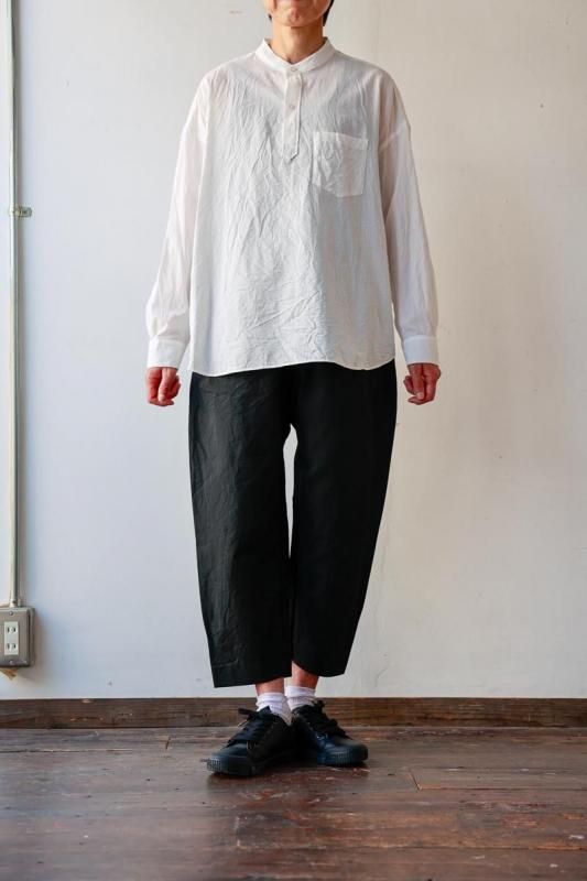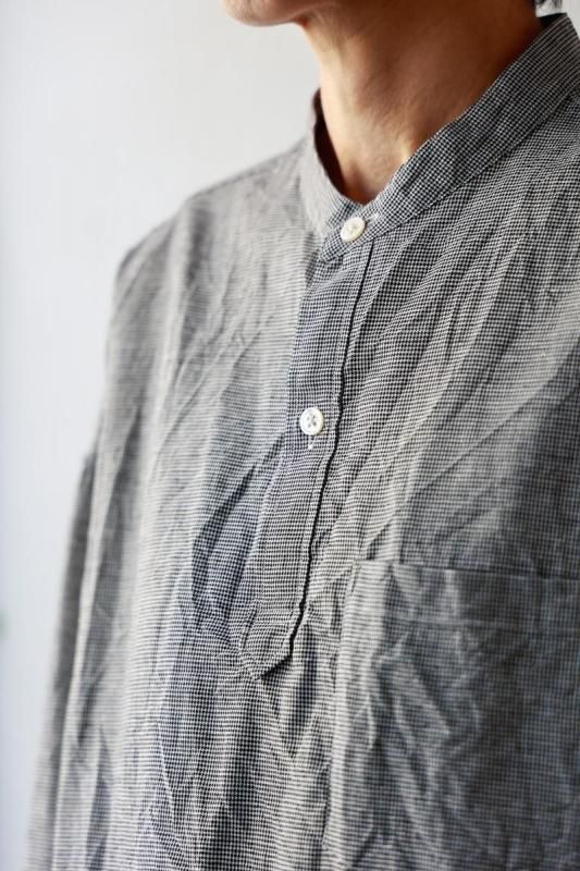 商品名 ゴーシュ コットンリネンガーゼ スタンドカラーシャツ 素材 綿85%、麻(リネン)15% カラー 千鳥柄、ホワイト サイズ 2 (ワンサイズ) 肩幅 58.5 身幅 62 着丈 ホワイト:前67、後ろ71 /千鳥柄:前69.5、後ろ72.5 袖丈 48.5(cm) *個体差があります。サイズの多少の誤差はご了承くださいませ。 2025年秋冬。ゴーシュの新作シャツです。 すぐに着られるサラサラした素材。 新型のスタンドカラーシャツは、 ふわっと着ていただく、ゆるいシルエットになります。 いつもと違う雰囲気で、太めのパンツで ゆるっとしたコーディネイトもおすすめです。 身長160センチ 薄手のコットンリネン生地になります。 柔らかさの中に、ほんのり麻のサラッとした手触りを感じられる、 ナチュラルな風合いです。 *製品洗い加工が施してありますので、洗いざらしの強めのシワ感があります。 自然な風合いをお楽しみ下さい。 一点一点に多少の歪みやシワ感、サイズの個体差があります。予めご了承下さい。 リネン混の生地に季節は関係ないそうです。 リネンには熱を保つ効果があり、混紡する素材や厚みによっては、秋冬も活躍する生地になるのです。 長いシーズン使える便利な素材ですね。 袖丈はやや長め。 袖口はカフスのデザインですので、 お好みでロールアップして下さいね。 ホワイトの方が透け感が多めです。 ホワイトは、麻のムラ糸感があり、薄い点々のようなものがみられます。 風合いのひとつとしていただければと思います。 *インナーに黒のタンクトップ着用 ボトムをスカートに変えてみました。 ※パソコンのモニター環境により、商品の色味が実物と異なって見える場合がございます。 予めご了承ください。