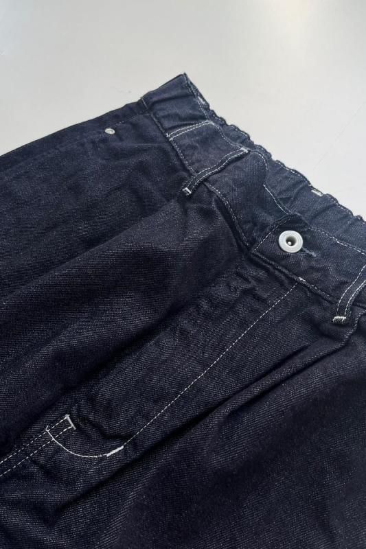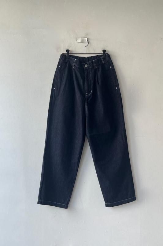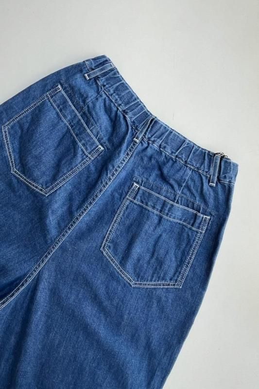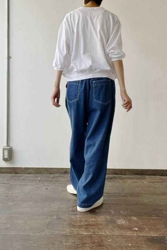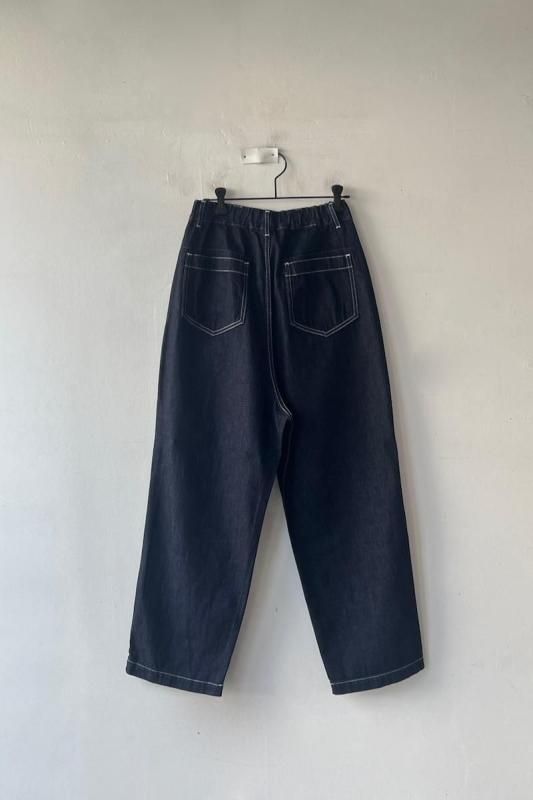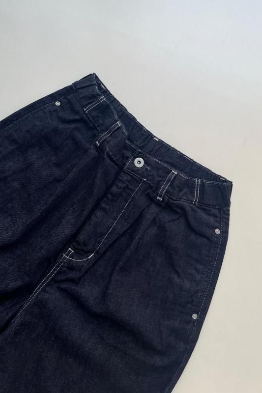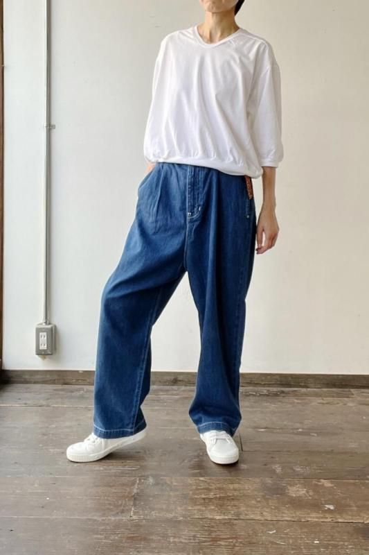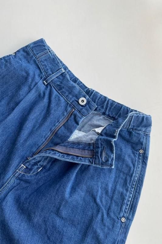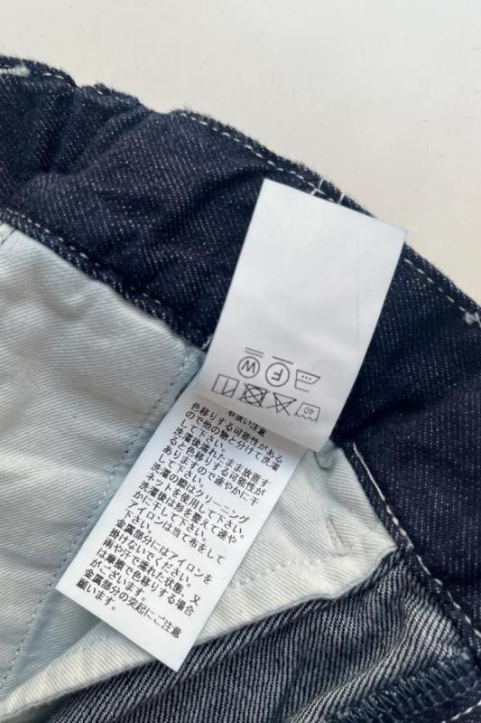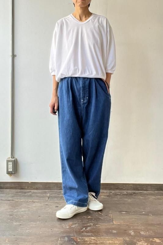 素材 綿100% カラー *カラーによって値段が違います。 インディゴ(濃紺) →¥33,000 (in tax) ユーズドウォッシュ →¥34,100 (in tax) サイズ 0 、1 、2 0サイズ ウェスト *約62〜72 股上 40 股下 58 裾幅 20 わたり幅 33 (cm) 1サイズ ウェスト *約66〜76 股上 40.5 股下 ユーズドウォッシュ 59.5 /インディゴ61 裾幅 21 わたり幅 34 (cm) 2サイズ ウェスト *約70〜79 股上 41.5 股下 61 裾幅 22 わたり幅 35 (cm) *ウエストは後ろにゴムが入っていますので伸縮します。 個体差がございます。サイズの多少の誤差はご了承くださいませ。 生地はデニムだけれどカタチはタックパンツ。 カジュアルになりすぎずラクに履ける2025年秋の新作パンツです。 暑い季節にもすぐに使える、薄地で軽いはき心地です。 タックが1本入っていますので、パンツっぽい柔らかなシルエットです。 (すそに向かって細くなる緩やかなテーパードシルエットです。) 身長160センチ ユーズドウォッシュのサイズ1着用 ¥34,100 (in tax) コーディネイト homspun 6分袖Vネックプルオーバー(サラシ) しなやかで柔らかい風合いが特徴の8オンスのムラ糸デニムを使用した、 ワンタックパンツです。 *デニム生地のオンスとは、重さのことになります。 数字が小さいと軽くなります。(一般的なデニムは、13オンス前後が多いです。) ユーズドウォッシュ は、ブリーチ加工が施してあります。 色ムラ感ややや薄くなった箇所がみられますが、ユーズド風な風合いとしてしていただけたらと思います。 ウエストは後ろがゴム。 股上はかなり深いです。 * * インディゴのサイズ1着用 ¥33,000 (in tax) コーディネイト YAECA STOCK ポケット付き半袖Tシャツ(メンズ/ダークネイビーのSサイズ) ベルト通しはぐるっと5箇所。 お好みでロールアップも。 向かって左より ユーズドウォッシュ →¥34,100 (in tax) インディゴ(濃紺) →¥33,000 (in tax) ※パソコンのモニター環境により、商品の色味が実物と異なって見える場合がございます。 予めご了承ください。