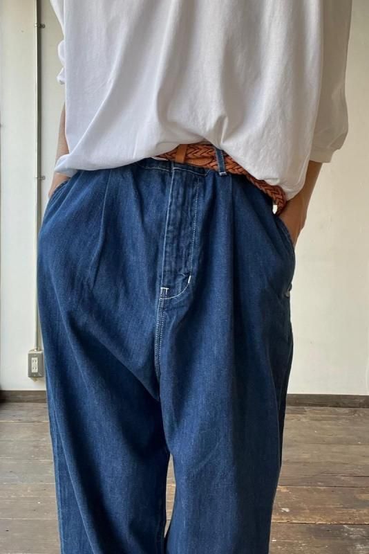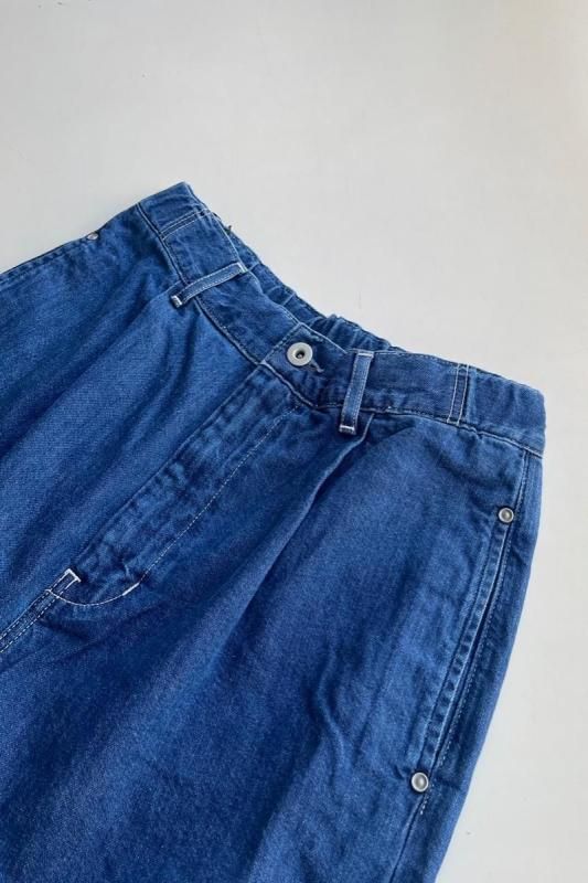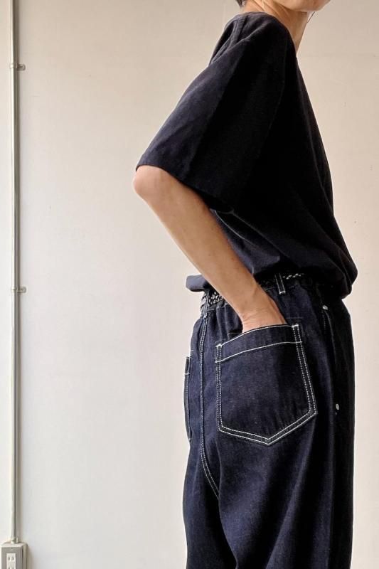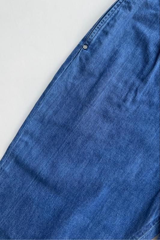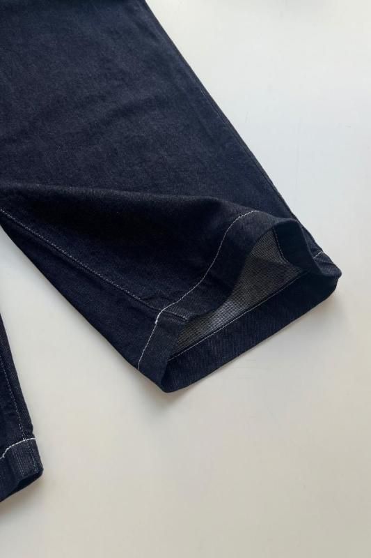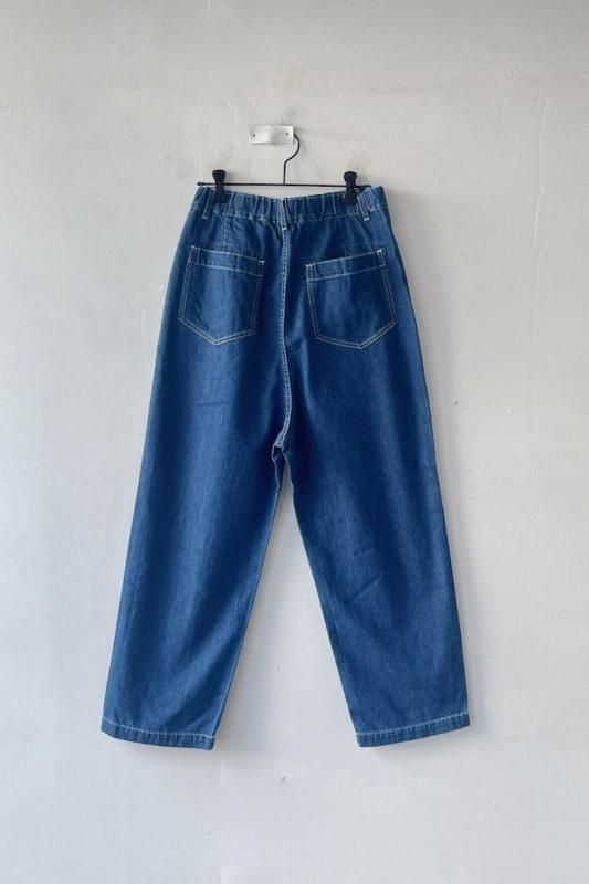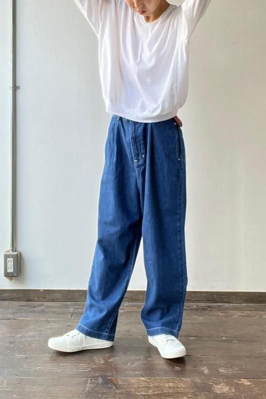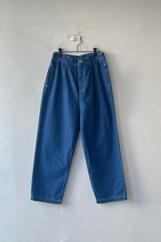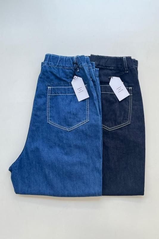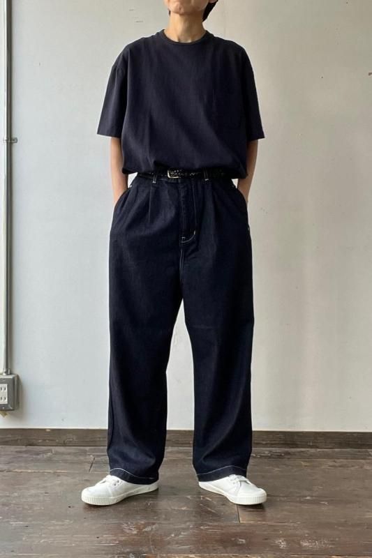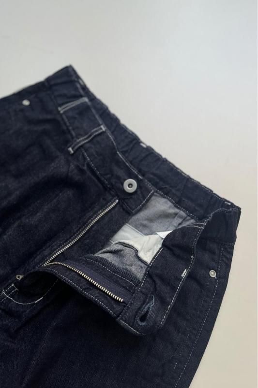素材 綿100% カラー *カラーによって値段が違います。 インディゴ(濃紺) →¥33,000 (in tax) ユーズドウォッシュ →¥34,100 (in tax) サイズ 0 、1 、2 0サイズ ウェスト *約62〜72 股上 40 股下 58 裾幅 20 わたり幅 33 (cm) 1サイズ ウェスト *約66〜76 股上 40.5 股下 ユーズドウォッシュ 59.5 /インディゴ61 裾幅 21 わたり幅 34 (cm) 2サイズ ウェスト *約70〜79 股上 41.5 股下 61 裾幅 22 わたり幅 35 (cm) *ウエストは後ろにゴムが入っていますので伸縮します。 個体差がございます。サイズの多少の誤差はご了承くださいませ。 生地はデニムだけれどカタチはタックパンツ。 カジュアルになりすぎずラクに履ける2025年秋の新作パンツです。 暑い季節にもすぐに使える、薄地で軽いはき心地です。 タックが1本入っていますので、パンツっぽい柔らかなシルエットです。 (すそに向かって細くなる緩やかなテーパードシルエットです。) 身長160センチ ユーズドウォッシュのサイズ1着用 ¥34,100 (in tax) コーディネイト homspun 6分袖Vネックプルオーバー(サラシ) しなやかで柔らかい風合いが特徴の8オンスのムラ糸デニムを使用した、 ワンタックパンツです。 *デニム生地のオンスとは、重さのことになります。 数字が小さいと軽くなります。(一般的なデニムは、13オンス前後が多いです。) ユーズドウォッシュ は、ブリーチ加工が施してあります。 色ムラ感ややや薄くなった箇所がみられますが、ユーズド風な風合いとしてしていただけたらと思います。 ウエストは後ろがゴム。 股上はかなり深いです。 * * インディゴのサイズ1着用 ¥33,000 (in tax) コーディネイト YAECA STOCK ポケット付き半袖Tシャツ(メンズ/ダークネイビーのSサイズ) ベルト通しはぐるっと5箇所。 お好みでロールアップも。 向かって左より ユーズドウォッシュ →¥34,100 (in tax) インディゴ(濃紺) →¥33,000 (in tax) ※パソコンのモニター環境により、商品の色味が実物と異なって見える場合がございます。 予めご了承ください。