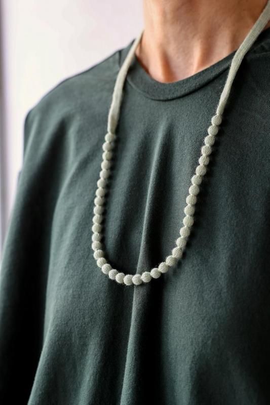 素材 毛100%(中にパールビーズが入っています。) カラー セージ杢 ピンク レッド ブルー杢 ブラック サイズ 長さ87cm *ニットを使用している為、伸縮性があります。 伸ばさずに平置きした状態で測りました。 *個体差があります。多少の誤差はご了承下さいませ。 ホームスパン から秋冬のおしゃれのアクセントにぴったりなネックレスが届きました。 ニット素材で軽くてふんわり。 結んで付けるタイプになります。 結び方次第で、いろいろなアレンジができます。 Tシャツ、シャツ、セーター、タートルのアクセントにいかがですか。 ピンク スタンドカラーのネックに沿うように付けてみました。 コーディネイト シャツ/ゴーシュ ピマタイプライター スタンドカラーシャツ(ホワイト) パンツ/koton バックワードパンツ(ホワイトグレー/サイズ2)¥28,600( in tax) セージ杢 身長160センチ コーディネイト homspun 6分袖Vネックプルオーバー(ダークグリーン) homspun ウールリネン ワイドギャザーパンツ(ダークグリーンのSサイズ) 丸いパールビーズは直径約7ミリ。 上より セージ杢 ピンク レッド ブルー杢 ブラック 結ぶ部分は約7ミリ幅 端が短くなるように、2重縛りにすれば、結び目を取らずにそのままスポッとかぶれる長さになります。 ブルー杢 リボンを前で結んで。結び目をアクセントに。 そのまま結び目を後ろにして、Tシャツの首元に沿う長さで付けてみました。 2重巻にしてみました。チョーカーのようになりますが、首にフィットします。 レッド 前で長めのところで結んで。 そのまま結び目を後ろにしました。 ブラック セージ杢 ピンク セージ杢 ピンク レッド ブルー杢 ブラック ネイビー杢のネックレスをシャツの上からも付けてみました。 端が短くなるように、2重縛りにしています。 他のアレンジを楽しんでみました。 ※パソコンのモニター環境により、商品の色味が実物と異なって見える場合がございます。 予めご了承ください。