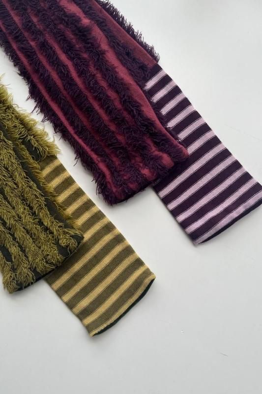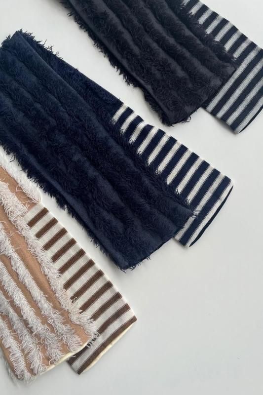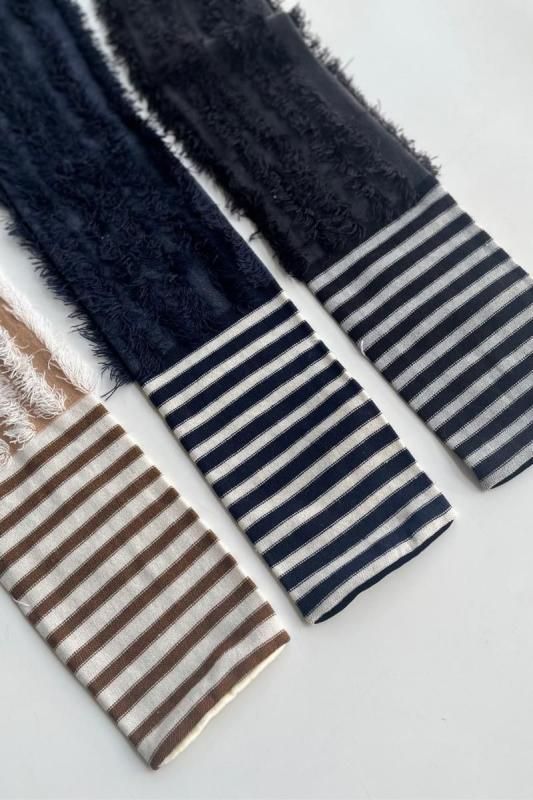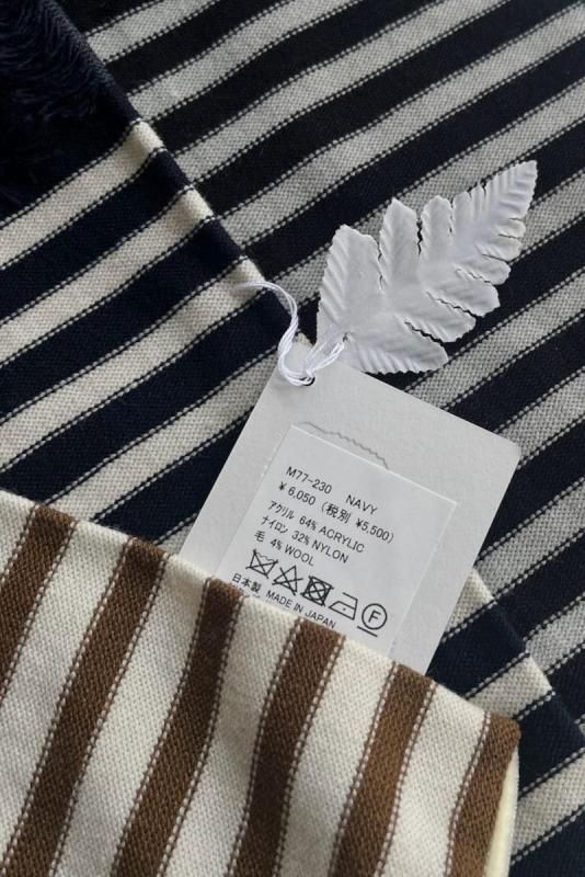 商品名 ANTIPAST ソックスニット スモールマフラー with VELVET 素材 アクリル64%、ナイロン32%、毛4% カラー ベージュ カーキ ワイン ネイビー ブラック サイズ フリー 幅11〜12cm、長さ73〜75cm *とても伸縮性があります。伸ばさずに平置きした状態で測りました。 個体差があります。サイズの多少の前後の誤差はご了承くださいませ。 可愛い柄のソックス生地を使ったマフラーは、シンプルな着こなしのアクセントになります。 ふんわり柔らかいので巻きやすく、1回くるっと巻くだけでいい長さ。 ちょっと巻くのに使いやすいです。 室内でそのまま付けていられるのも便利ですね。 首に巻いているのは、ワイン。 手に持っているのは、カーキ。 ふわふわのフリンジとボーダーの組み合わせが楽しいですね。 ワイン。 両はしには、さりげなくベロアが付いています。 向かって左がカーキ。右がワイン。 向かって左から。 ベージュ、ネイビー、ブラック 柄もいろいろ。迷いますね! ※パソコンのモニター環境により、商品の色味が実物と異なって見える場合がございます。 予めご了承ください。