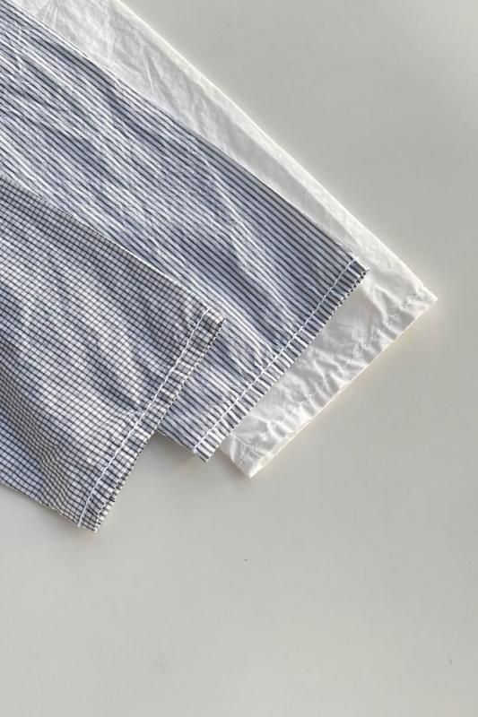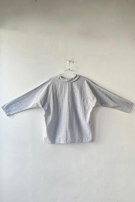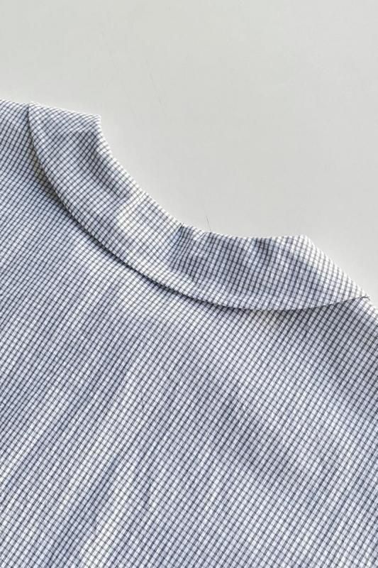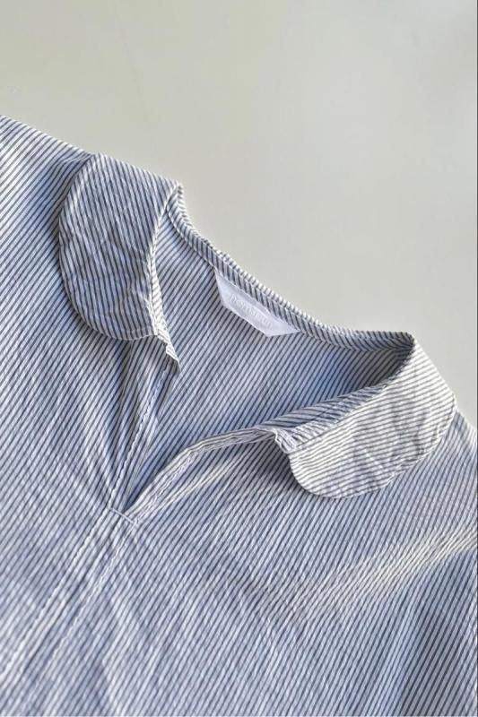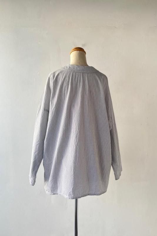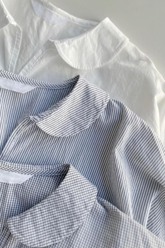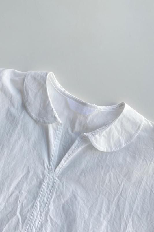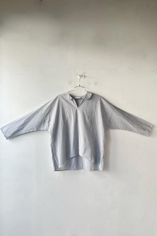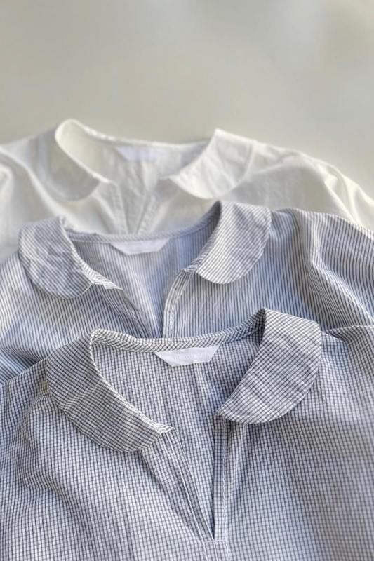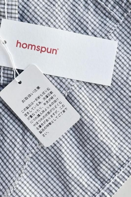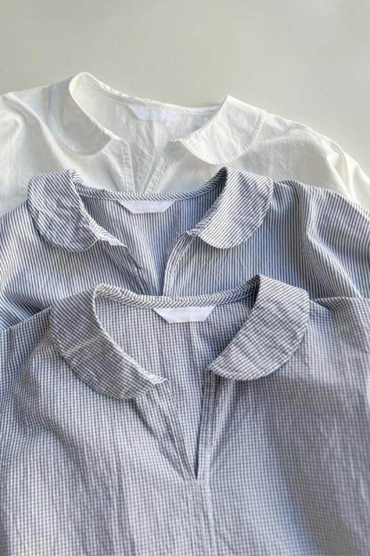 素材 綿100% カラー ホワイト、チェック、ストライプ サイズ フリー 肩幅 74 身幅 66 着丈 前61/後ろ71 裾幅 63 袖丈 40 袖口幅 13 (cm) *個体差あります。サイズの多少の誤差はご了承くださいませ。 ホームスパン の秋冬新作ブラウスです。 丸いフラットカラーがスリット開きになった、ほんのり甘さのあるプルオーバーブラウス。 肩が落ちたドロップショルダー、身幅もゆったりしたサイズ感です。 ホームスパン らしい、所々の太いステッチもポイントです。 薄地ですが目の詰まった、ほんのりハリ感のある風合いです。 洗い加工により、ラフなシワ感があります。 滑らかで、うっすら光沢感も感じられますので、カジュアルさを抑えたブラウスです。 インナーにタートルネックも重ねられますので、長いシーズン使えます。 裾は前上がりのデザイン。後ろはヒップが隠れるくらい。 ぶかっとしているようで、着てみるとふんわりバランスよく着ていただけると思います。 秋はインナーにタートルネックを重ねられます。 チェック 前身頃のみ切りっぱなし。(ミシン処理はしてあります。) 袖口はシンプルな作り。 ストライプ ホワイト ※パソコンのモニター環境により、商品の色味が実物と異なって見える場合がございます。 予めご了承ください。