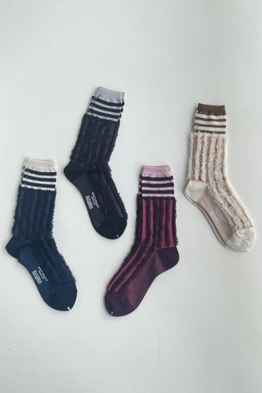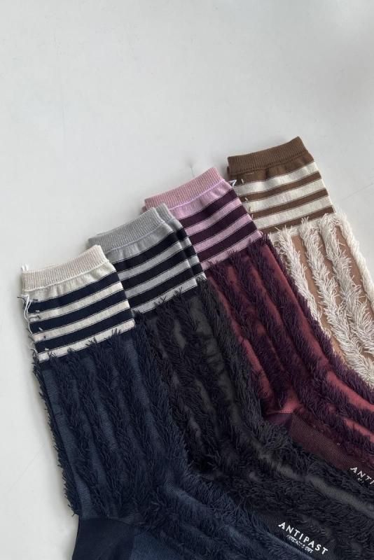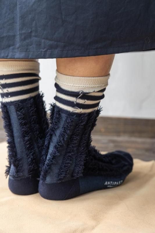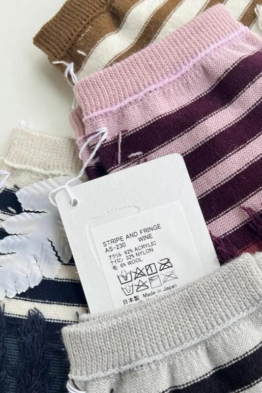 素材 アクリル62%、ナイロン32%、毛6% カラー ベージュ ブラック ネイビー ワイン サイズ フリー(レディス 約23〜25cm) *かかとから履き口までの高さ約24.5cm *個体差がございます。 フリンジがアクセント。 足元に暖かみと可愛らしさをプラスしてくれるソックスです。 ネイビー このソックスは裏生地をデザインとして使っているため、 特にボーダーの部分の糸が出ていますが、 編み地の特性上、あえて出しています。 糸は切らずにそのままお履き下さいませ。(間違えて本体の生地を切ってしまわないため。) 裏生地ですので、ボーダーもパキッとせずに優しい雰囲気です。 向かって左より ネイビー ブラック ワイン ベージュ ※パソコンのモニター環境により、商品の色味が実物と異なって見える場合がございます。 予めご了承ください。