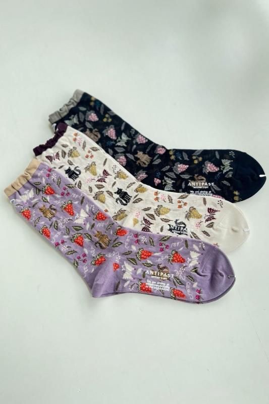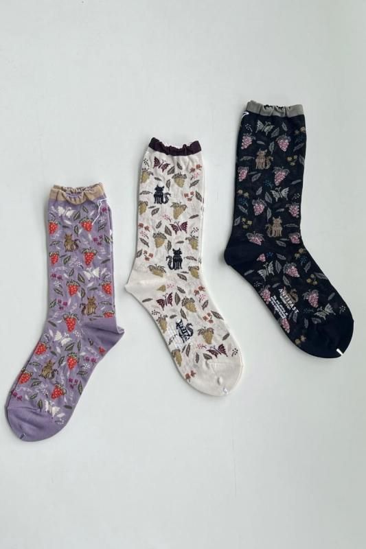 素材 綿50%、ナイロン30%、アクリル20% カラー ブラック、アイボリー、ラベンダー サイズ フリー(レディス 約23〜25cm) *かかとから履き口までの高さ約22cm *個体差がございます。 「GARDEN CAT」名前の通り、お庭で猫ちゃんが遊んでいるような、 キュートな柄のソックスです。 ウールは入っていませんが、秋冬の新作ソックスです。 目の詰まった、伸縮性のある編み地ですので、夏以外履いていただけると思います。 上より ブラック アイボリー ラベンダー ※パソコンのモニター環境により、商品の色味が実物と異なって見える場合がございます。 予めご了承ください。