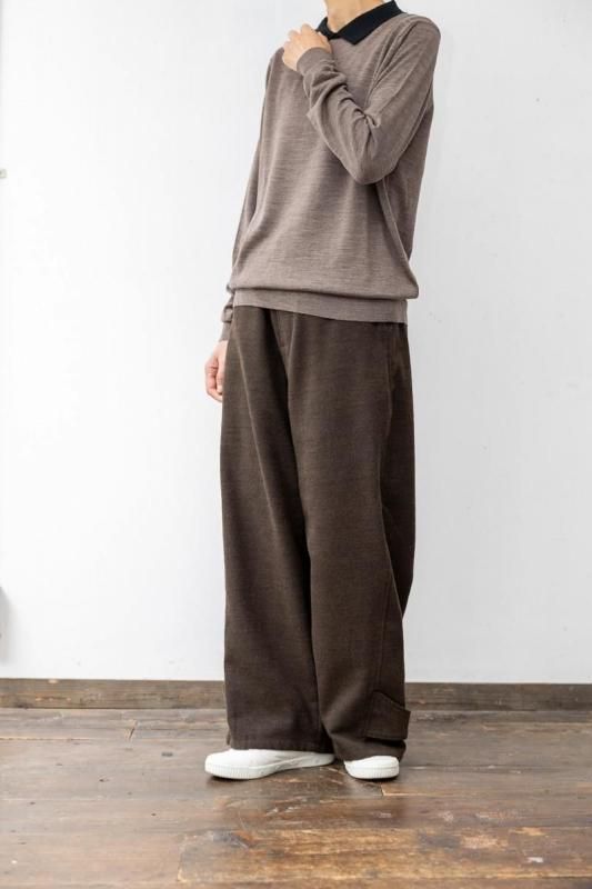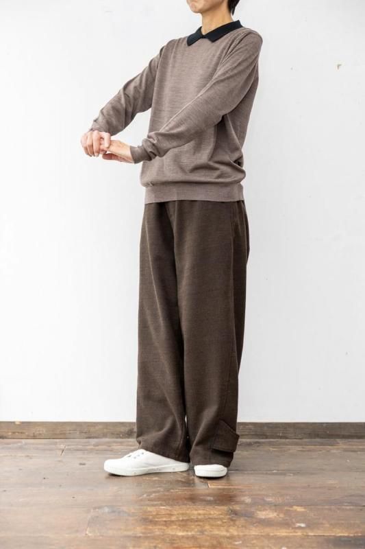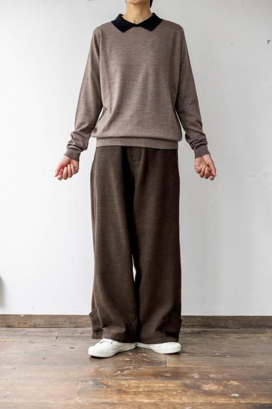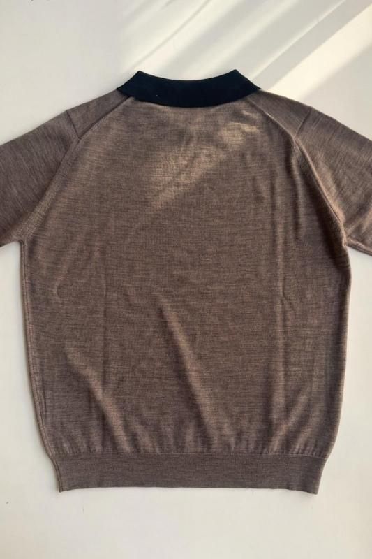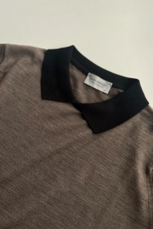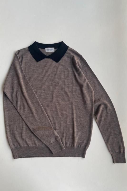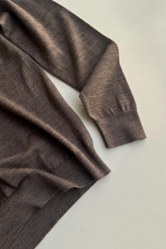 素材 メリノウール100% カラー (ボディ)マッシュルーム ×(襟)ブラック サイズ M (SサイズとMサイズの展開ですが、サスコンではMサイズのみの紹介です。) Mサイズ 肩幅 38 身幅 50 着丈 59 袖丈 61 (cm) *ニット製品につき、サイズの多少の誤差はご了承くださいませ。 (伸ばさずに平置きした状態で測りました。) イギリス製 長く愛用したいJOHN SMEDLEYの上質ニット。 こちらは日本限定コレクション。 1枚でシンプルに着るだけでも品よく。 シックな配色のポロニットです。 程よいゆとりのサイズ感ながら、スッキリしたシルエット。 襟のコントラストがアクセントです。 (ボディ)マッシュルーム ×(襟)ブラック ボディの色は、深い茶色、杢の色味になります。 ジョン スメドレーの代名詞でもあるハイゲージの30Gニット。 薄地になればなるほど生産には高度なテクニックを必要とします。 エクストラファインメリノウールを使用。 薄手ですが、暖かさもあり、表面の滑らかさとほのかな光沢感が特徴です。 秋の終わりの肌寒い季節から春先の寒さが残る季節まで、 長いシーズンお使いいただけます。 *ここから下の着画は実際よりも茶色味が薄く写っています。 大変申し訳ありませんが、カタチのみご参考にしていただけますでしょうか。 袖丈やや長めのデザインです。 素材がとても柔らかいので、袖口のリブのところでクシュっと、とまります。 身長160センチ Mサイズ着用 アクセサリーも映えます。 ※パソコンのモニター環境により、商品の色味が実物と異なって見える場合がございます。 予めご了承ください。