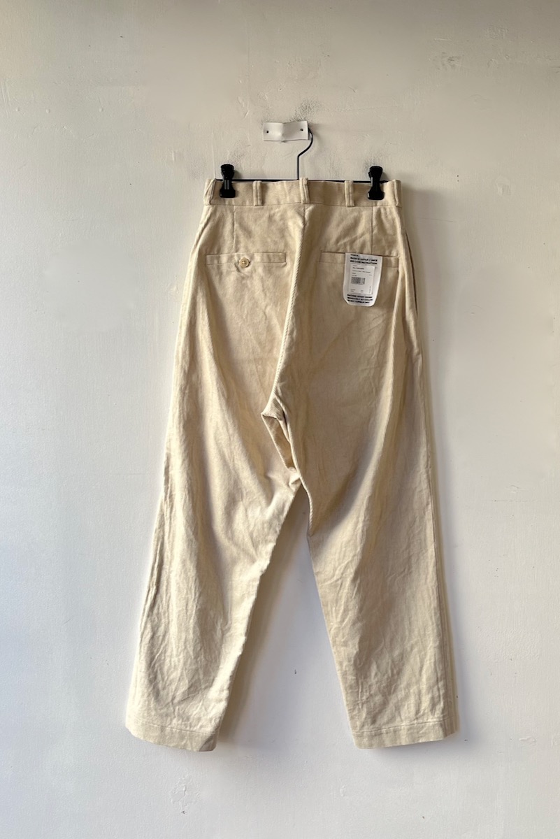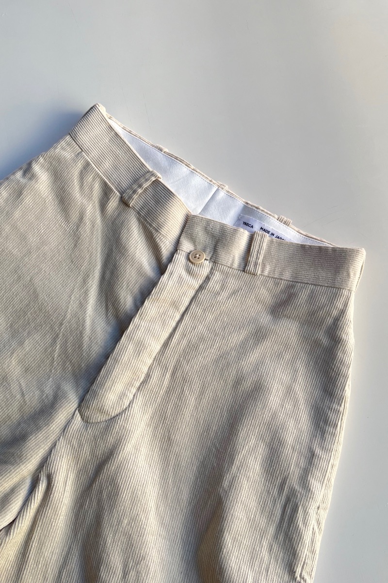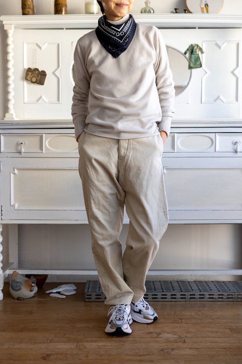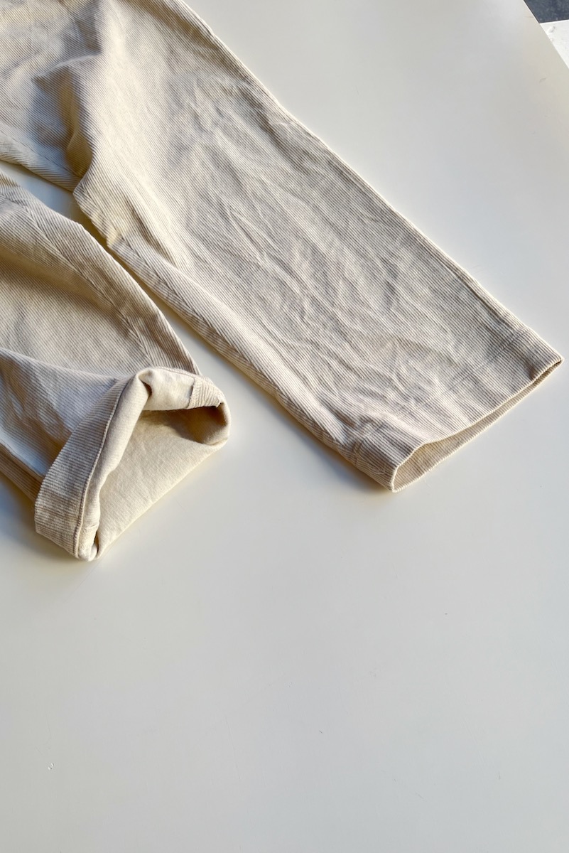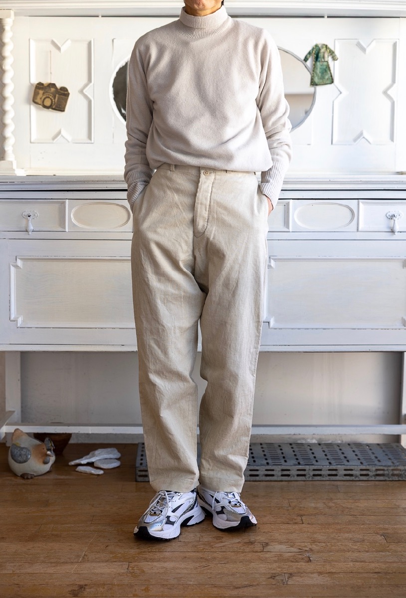 素材 綿70%、麻30% カラー ベージュ(キナリに近い白っぽい色味) サイズ 27,28,29 サイズ 27 ウェスト 65 股上 32 股下 68 裾幅 19 わたり幅 33 (cm) サイズ 28 ウェスト 68 股上 34 股下 70 裾幅 20 わたり幅 33 (cm) サイズ 29 ウェスト 72 股上 35 股下 72 裾幅 20.5 わたり幅 34 (cm) *個体差あります。多少の誤差はご了承下さいませ。 コットンとリネンを使ったコーデュロイパンツです。 股上の深いメンズライクなシルエット。 商品名はワイドストレートですが、もものあたりから裾に向かってゆるかに細くなる テーパードになります。すっきり履きたい時はロールアップして下さいね。 身長160センチ ベージュの27サイズ着用 上品な細身の畝です。 ほんのり起毛感はありますが、麻のサラッと感も感じられる、 やや薄地になりますので冬以外の肌寒い季節まで履いていただけると思います。 洗い加工が施してありますので、ラフなシワ感があります。 ※パソコンのモニター環境により、商品の色味が実物と異なって見える場合がございます。 予めご了承ください。