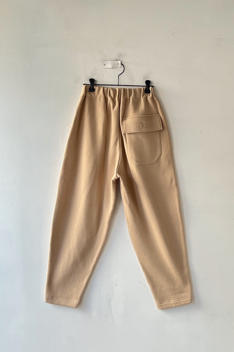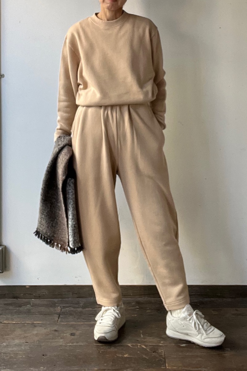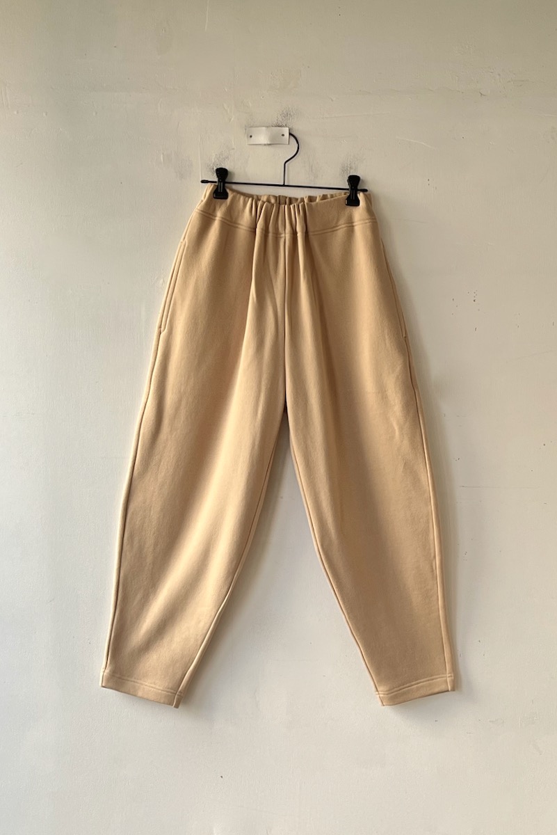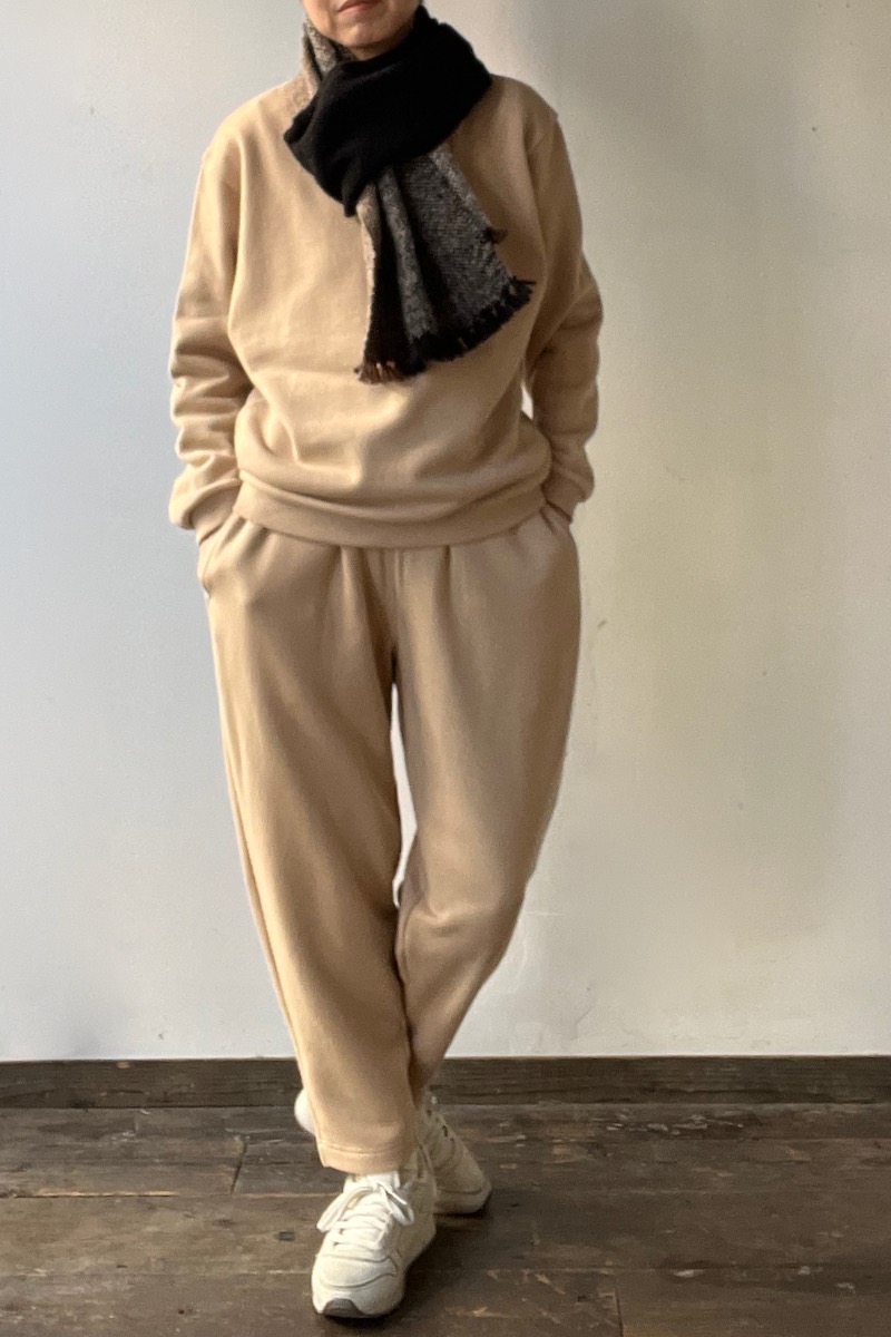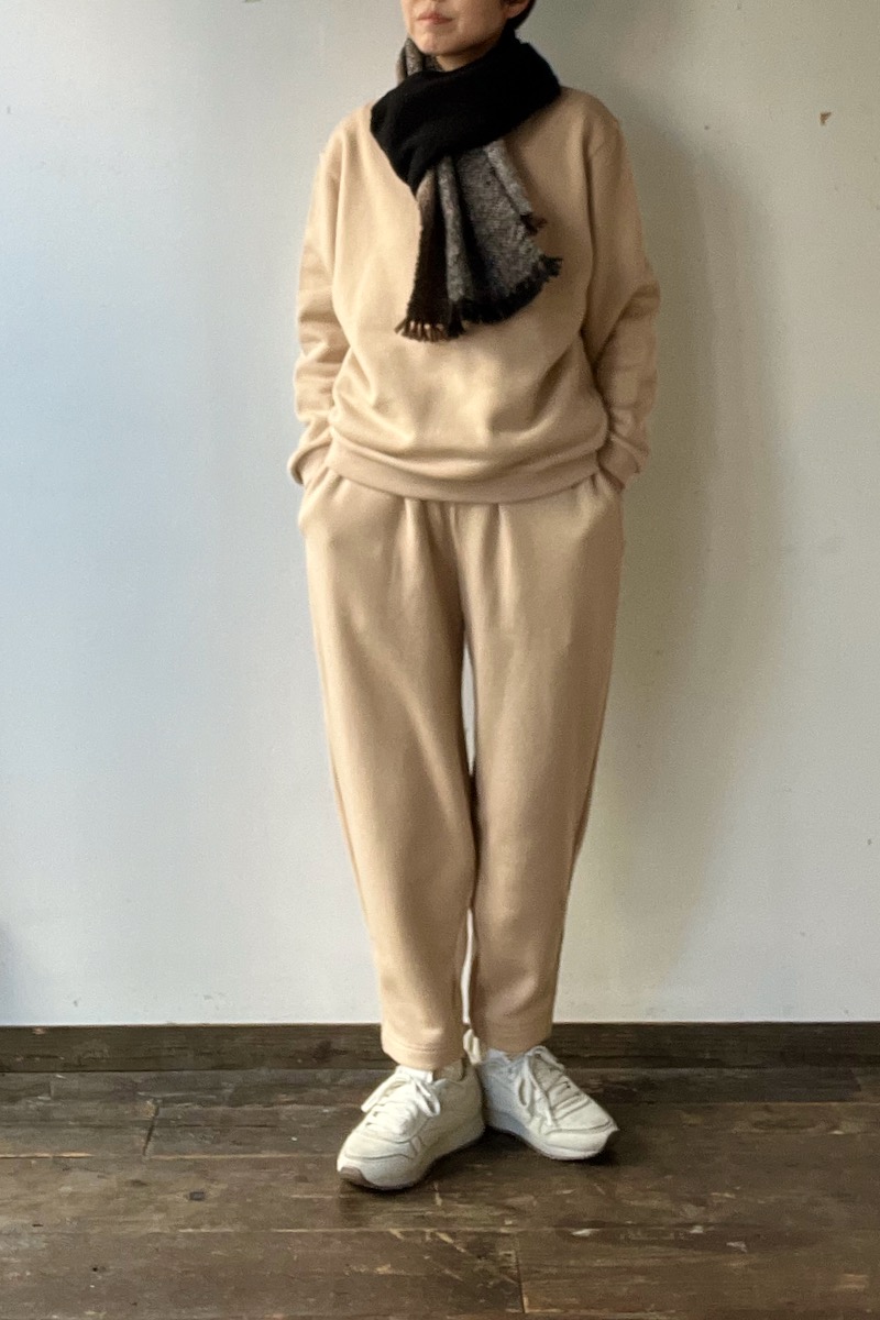 素材 綿100%(インド超長綿) カラー ベージュ(明るいベージュ) チャコール サイズ S、M *ユニセックスのS、M、Lサイズの展開ですが、 サスコンではSとMの取り扱いになります。 Sサイズ ウェスト 約60〜78 *紐で絞れます。 股上 34 股下 61 裾幅 14.5 わたり幅 33.5(cm) Mサイズ ウェスト 約66〜84 *紐で絞れます。 股上 37 股下 62.5 裾幅 15.5 わたり幅 35(cm) *ウエストは総ゴムと紐でサイズ調整可能です。 *伸縮性のある素材です。伸ばさずに平置きした状態で測りました。 *個体差があります。サイズの多少の誤差はご了承くださいませ。 はき心地がラクなスウエットパンツは、ルームウエアのイメージがありましたが、 普段のおしゃれにも履けるスウエットパンツが増えてきましたね。 2026年、春の新作。 ロロのスエットパンツは、裾に向かって細くなるペグトップ型。 テーパードに比べて、ペグトップの方がヒップ周りが膨らんだようなシルエットで、 丸みのあるシルエット、やや短めの丈で、可愛らしさがあります。 両脇にポケット、右ヒップにパッチポケットがあります。 インド超長面を使用した、中肉の裏毛を使用しています。 とても柔らかく、なめらかな肌ざわりです。 ベージュ(明るいベージュ) チャコール トレーナーとセットアップにもなります。 身長160センチ 上下ともベージュのSサイズ着用 コーディネイト ゴーシュ ベビーアルパカウールストール *パソコンのモニター環境により、商品の色味が実物と異なって見える場合がございます。 予めご了承ください。