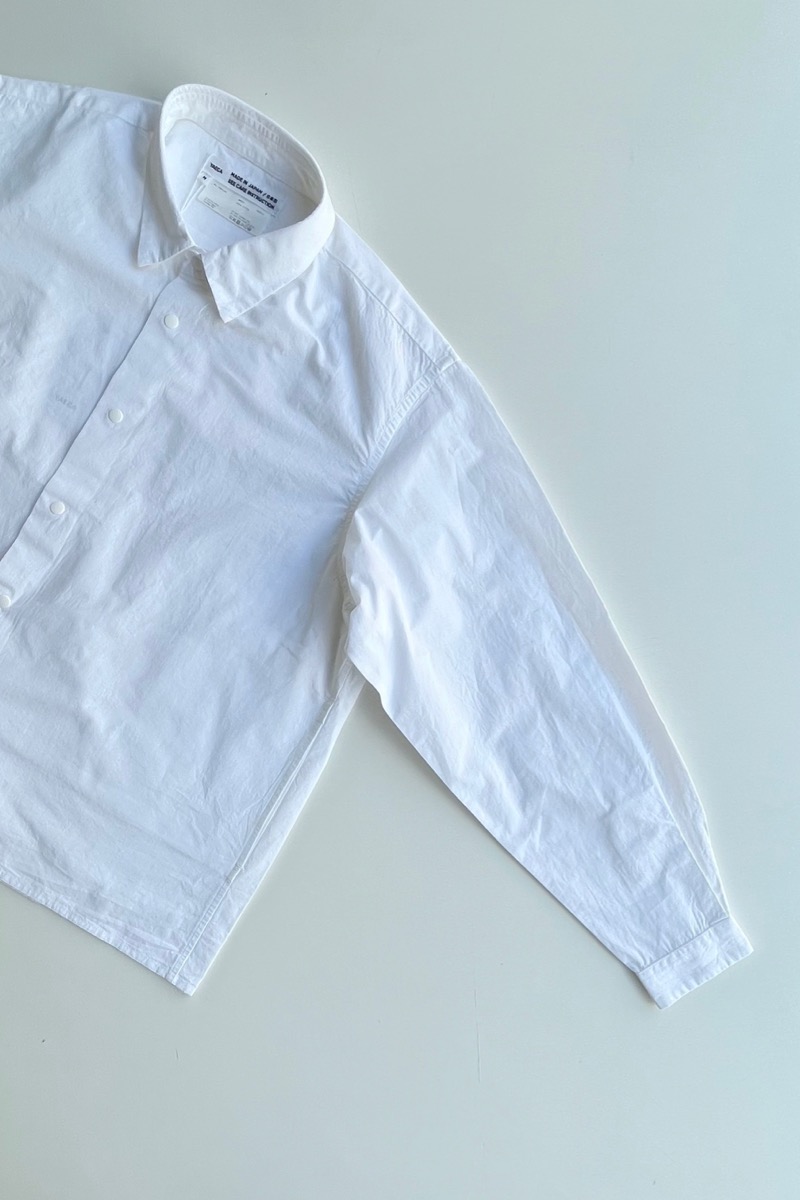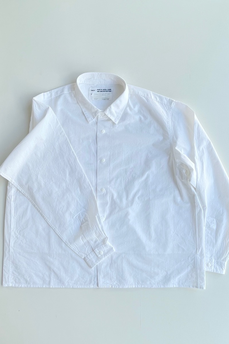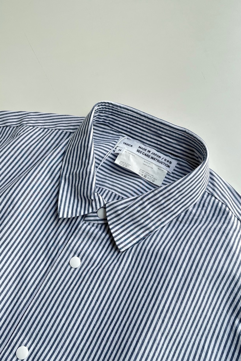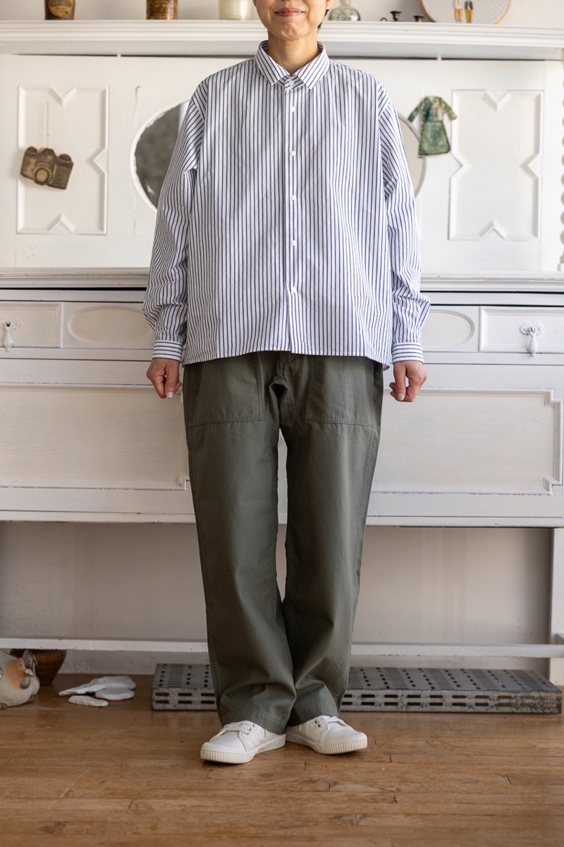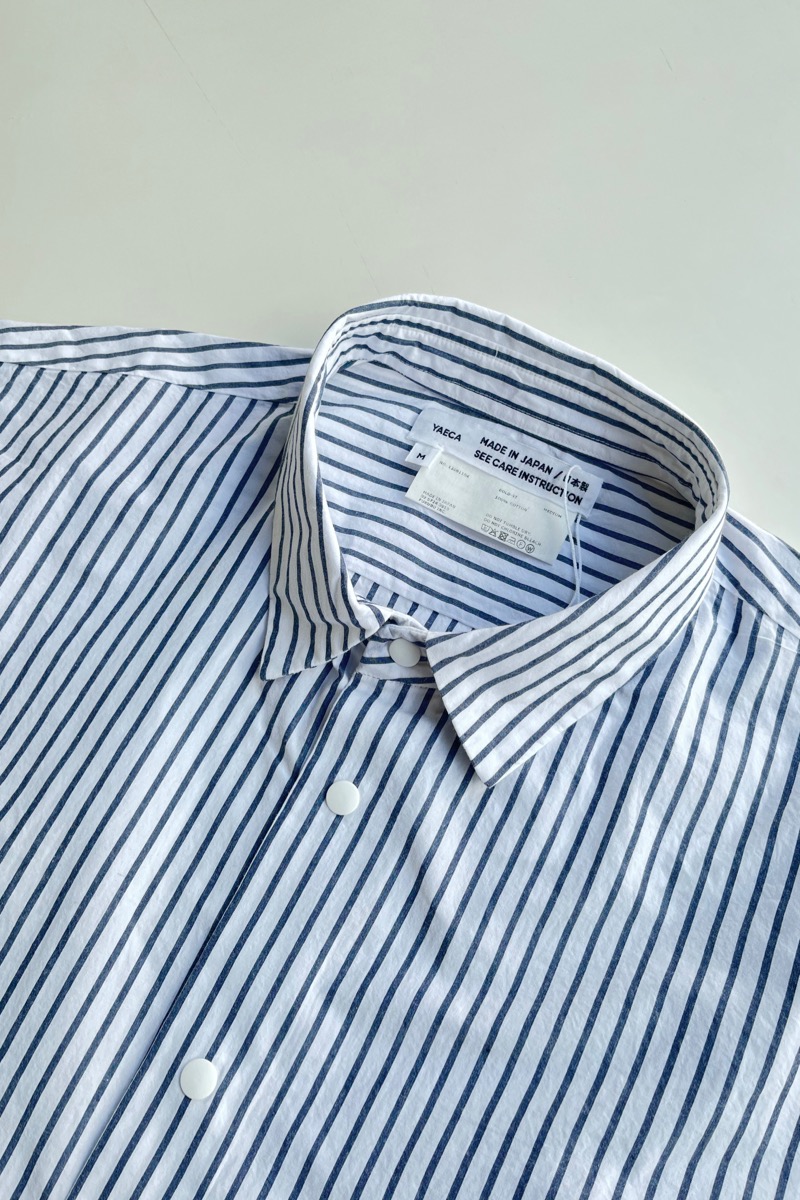 素材 綿100% カラー ホワイト ブロックストライプ(同じ幅のストライプ) ボールドストライプ(白の幅が広い) サイズ (レディス)S , M , L サイズS 肩幅 44 身幅 56.5 着丈 61 袖丈 53 (cm) サイズM 肩幅 45 身幅 58.5 着丈 62 袖丈 54 (cm) サイズL 肩幅 46 身幅 61 着丈 64 袖丈 55.5 (cm) *個体差あります。サイズの多少の誤差はご了承くださいませ。 ゆったりとした身幅で、リラックス感があります。 丈はやや短めのストンとしたスクエアカット。 両サイドにポケットが付いていますので、 ニットの下に着るというよりも、 1枚でシンプルに着たり。 ボタンを開けて軽い羽織として。 上から羽織を羽織ったりする着方をおすすめします。 洗い加工が施してありますので、洗いざらしの自然なシワ感を楽しんでいただく風合いになっています。 着脱も楽なスナップボタンがヤエカ らしい、軽い着心地のシャツです。 身長160センチ ブロックストライプ(同じ幅のストライプ)Sサイズ着用 上:ボールドストライプ(白の幅が広い)*白の分量が多いのでより爽やかな雰囲気。 下:ブロックストライプ(同じ幅のストライプ)*パキッとした雰囲気。 ボールドストライプ(白の幅が広い)Lサイズ着用 Lサイズを羽織って。 ノーアイロンの洗いざらしの風合いを楽しめますが、 お好みでアイロンをかけたい場合はお気をつけ下さい。 *品質表示タグにも記載してありますが、 ボタンにはアイロンを当てないでください。 (アイロンの熱でボタンが溶けてしまう場合があるため) ホワイトのMサイズ着用 Mサイズを羽織って。 ホワイト ブロックストライプ(同じ幅のストライプ) ボールドストライプ(白の幅が広い) ※パソコンのモニター環境により、商品の色味が実物と異なって見える場合がございます。 予めご了承ください。