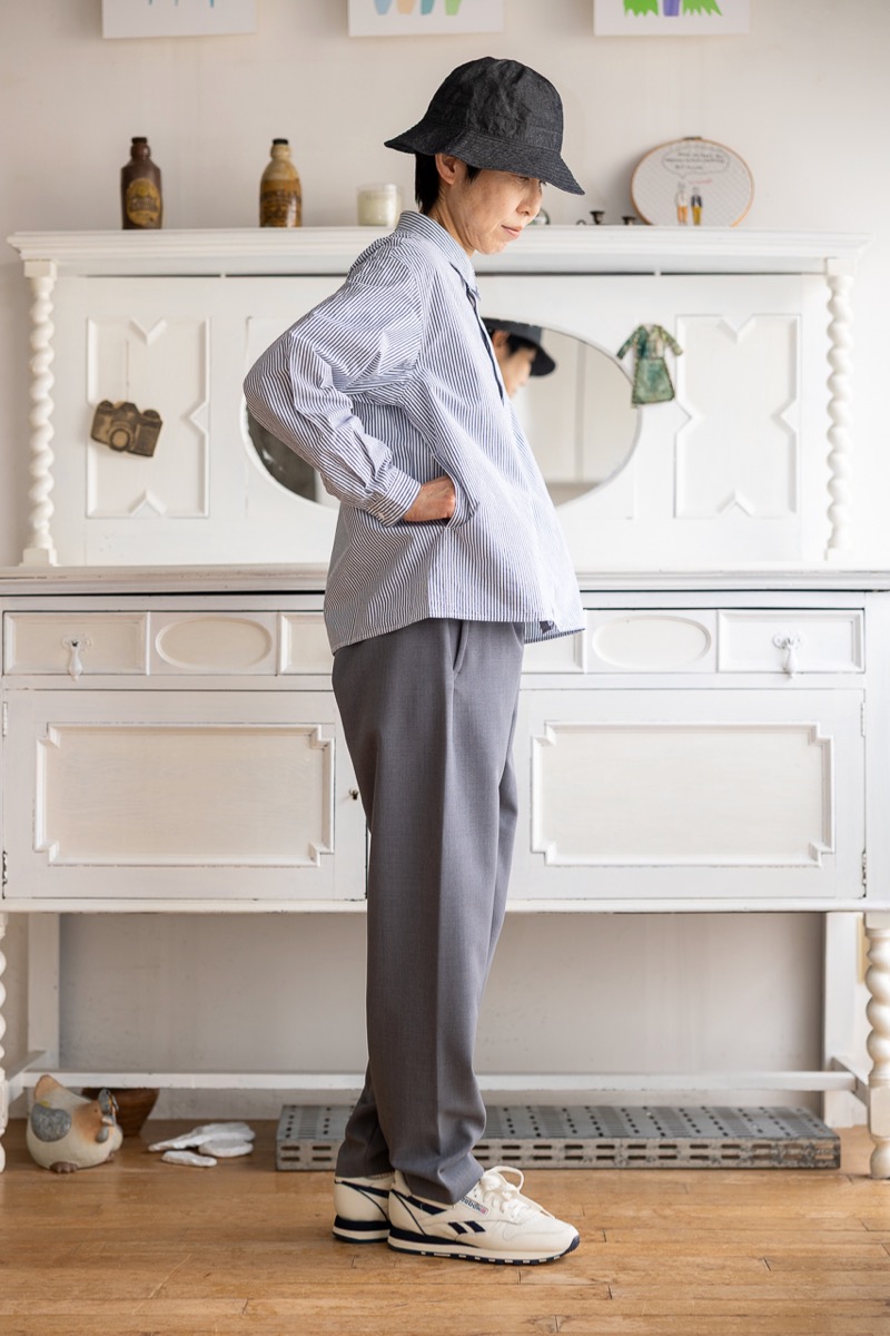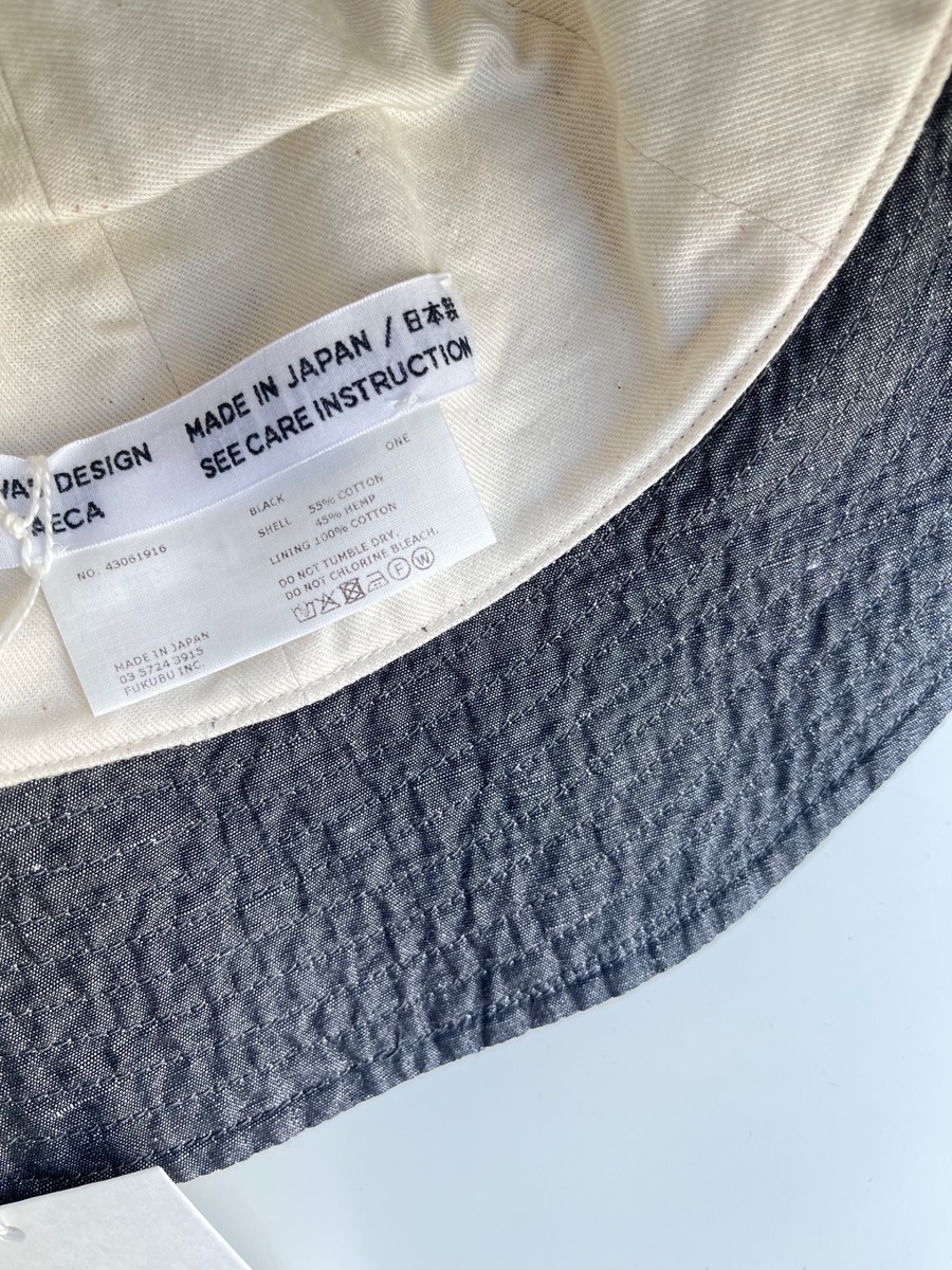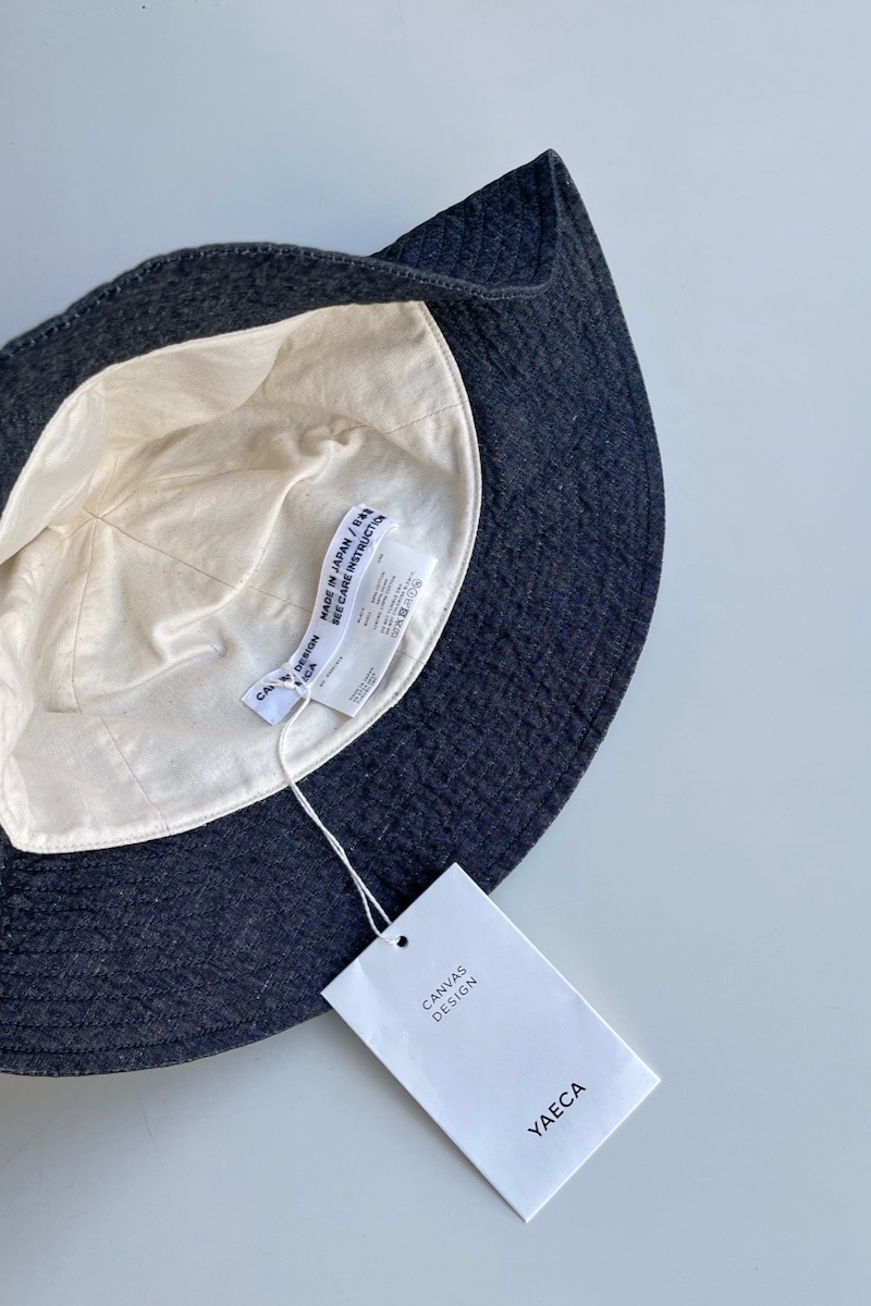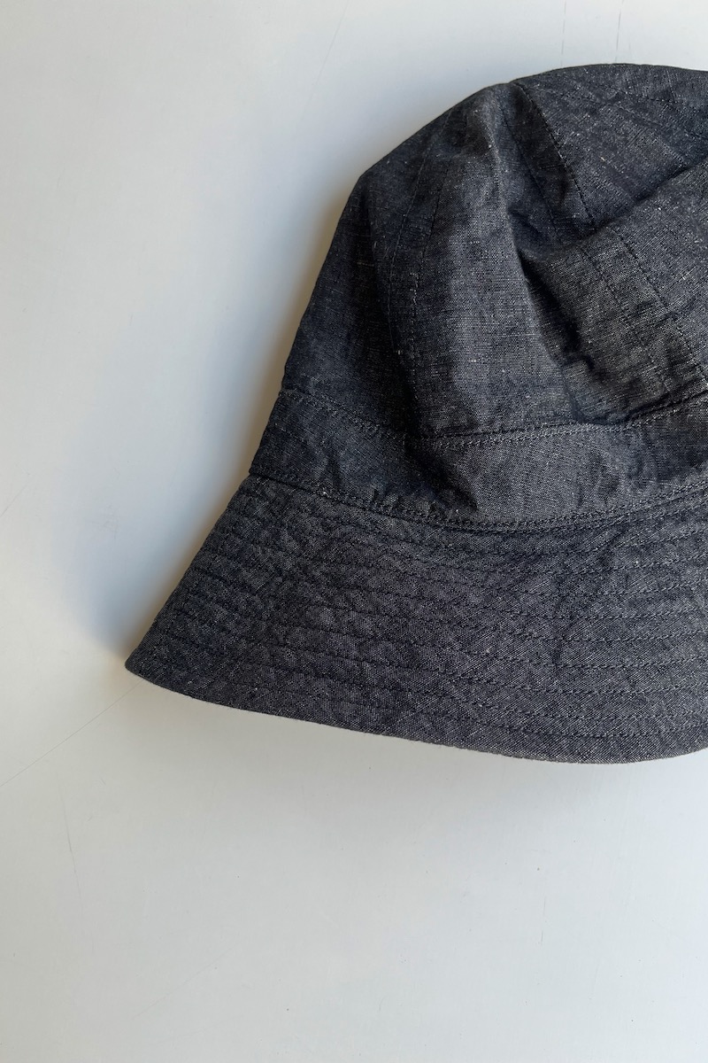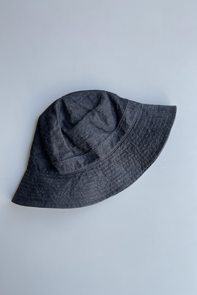 素材 表地:綿55%、植物繊維(ヘンプ)45% 裏地:綿100% カラー ブラック サイズ ワンサイズ(ユニセックス) 頭周り 61.5cm つば 6.5cm 高さ 16.5cm *平置きしたサイズになります。 個体差あります。サイズの多少の誤差はご了承くださいませ。 丸みのあるシルエットが特徴的なヤエカ のハット。 ユニセックスサイズのワンサイズ、 軽くて浅めのかぶり心地になります。 パッと見は、黒のシャンブレー?と思うほど 真っ黒ではなく、霜降り調の織りが軽やかな色味です。 プチプチとした白のネップがあります。 ※パソコンのモニター環境により、商品の色味が実物と異なって見える場合がございます。 予めご了承ください。
