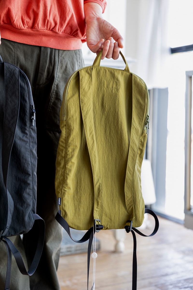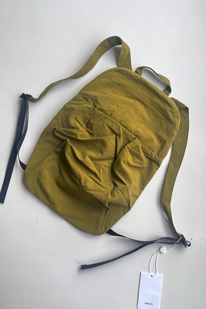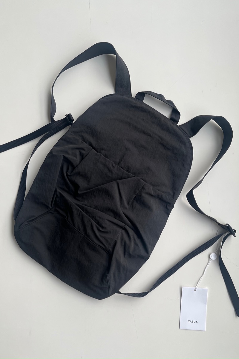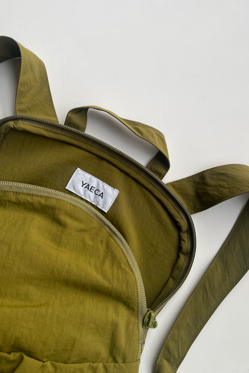 素材 ナイロン100% カラー チャコール、オリーブ サイズ ワンサイズ 横25×縦41 *個体差あります。 サイズの多少の誤差はご了承くださいませ。 2026年、今年も登場しました、ヤエカ のスカラベバッグ。 今年は軽くてややハリ感のある、ナイロン100%。 防風性能の高い生地で、自然なシワ感のある風合いです。 たくさん入れたり、重いものはオススメしませんが、 ちょっとお出かけや、サブバッグの感覚で使える小ぶりのリュックです。 背中にパッドがないので、小さく畳めます。 「スカラベ」とは、古代エジプトで崇められていたタマオシコガネという昆虫だそうです。 確かにコガネムシっぽい、コロンとしたフォルムが可愛らしいです。 向かって左より チャコール (真っ黒ではありませんが、ほぼ黒に近い、ほんの少し白っぽいチャコールになります) オリーブ オリーブ チャコール(真っ黒ではありませんが、ほぼ黒に近い、ほんの少し白っぽいチャコールになります。) 内側にファスナー付きのポケット一つありますが(上の切り替えの部分です。)、 浅いので、パスケースのような軽いものをおすすめします。 ※パソコンのモニター環境により、商品の色味が実物と異なって見える場合がございます。 予めご了承ください。