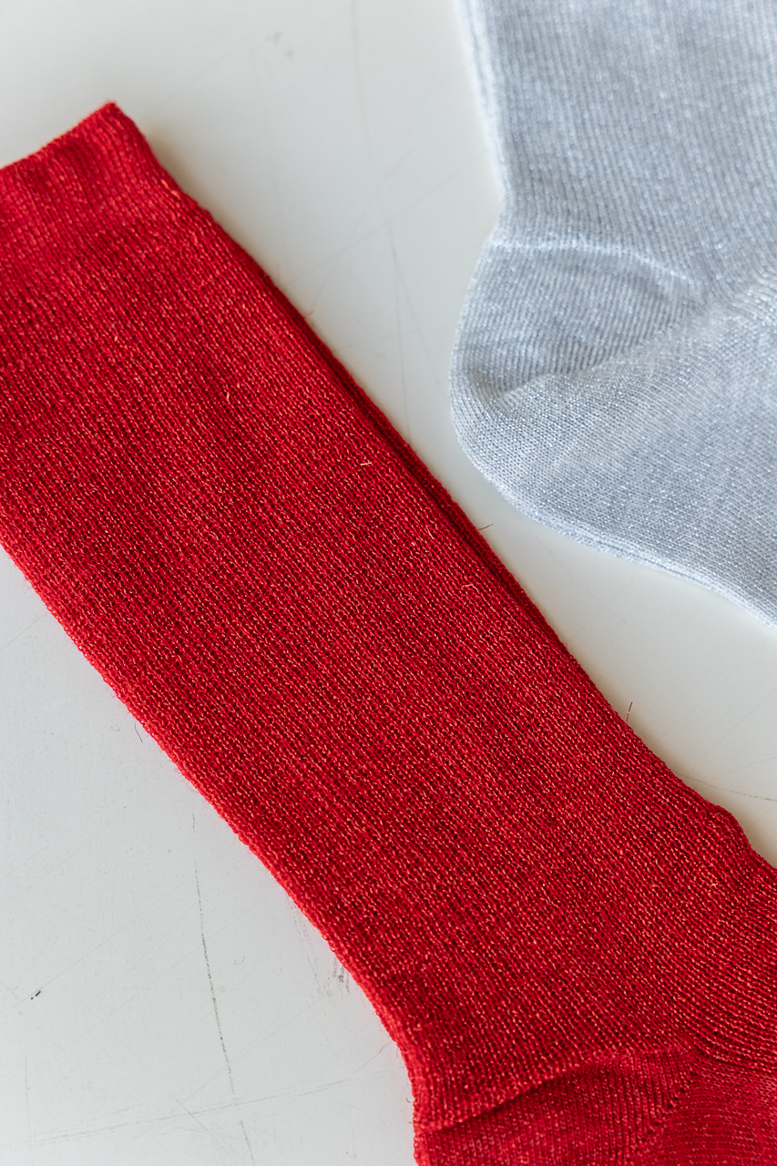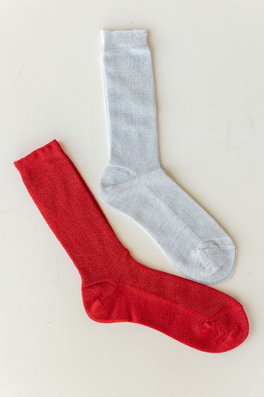 素材 コットン50%、ポリエステル45%、ポリウレタン5% カラー グリーン、ゴールド、シルバー、ブルー、アカ サイズ Free(21.5~24.5cm) 履き口からかかとまで約 24.0cm つま先からかかとまで21.0cm(約) (g)(グラム) のソックスライン ”tus +”より 「ANTIQUE RAME SOCKS」アンティーク ラメ ソックス が入荷しました。 Col: 左から グリーン、ゴールド、シルバー、ブルー、アカ Col: 左から アカ、シルバー キラキラなアンティークラメが可愛い、洗練されたデザインのソックス。 コーディネートに華やかさをプラスします。 シンプルなスタイルから、少し特別なシーンまで幅広くご使用いただけます。 ラメ特有のチクチク感は軽減されており、履きやすいアイテム。 薄手でこれからの季節に活躍してくれます。 可愛い袋入りなので、ちょっとしたプレゼントにもおススメです。 アカ着用 コーディネート (g)天竺プリントTee CHEETAH ホワイト着用 アカ着用 コーディネート Veritecoeur ドルマンプルオーバーニット red 着用 ※洗濯時は裏返しにして、洗濯ネットを使用することをお勧めします。