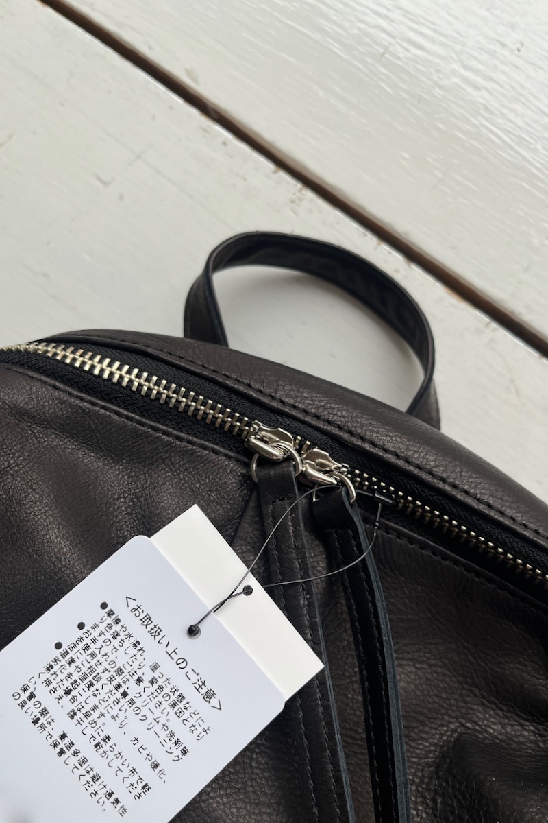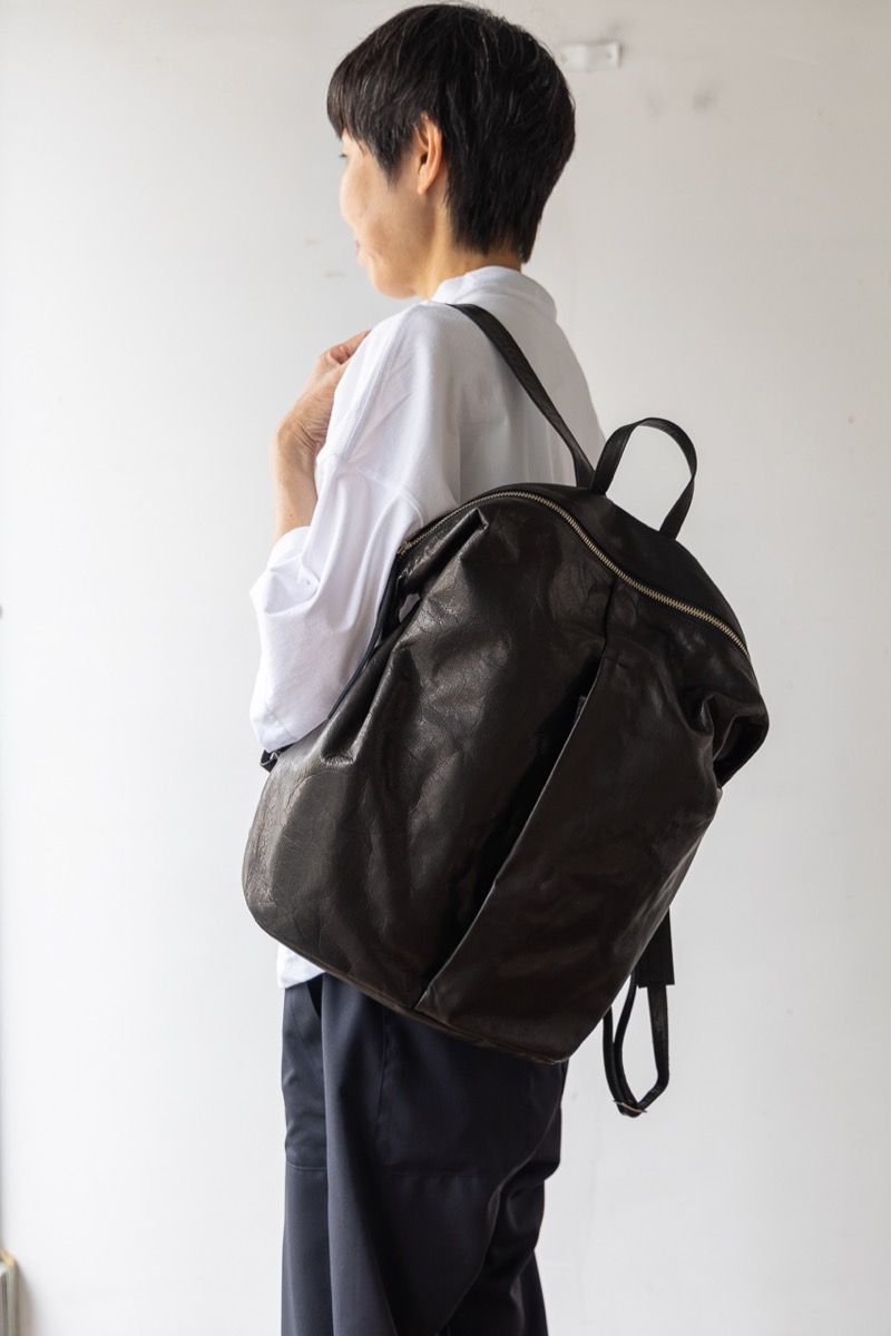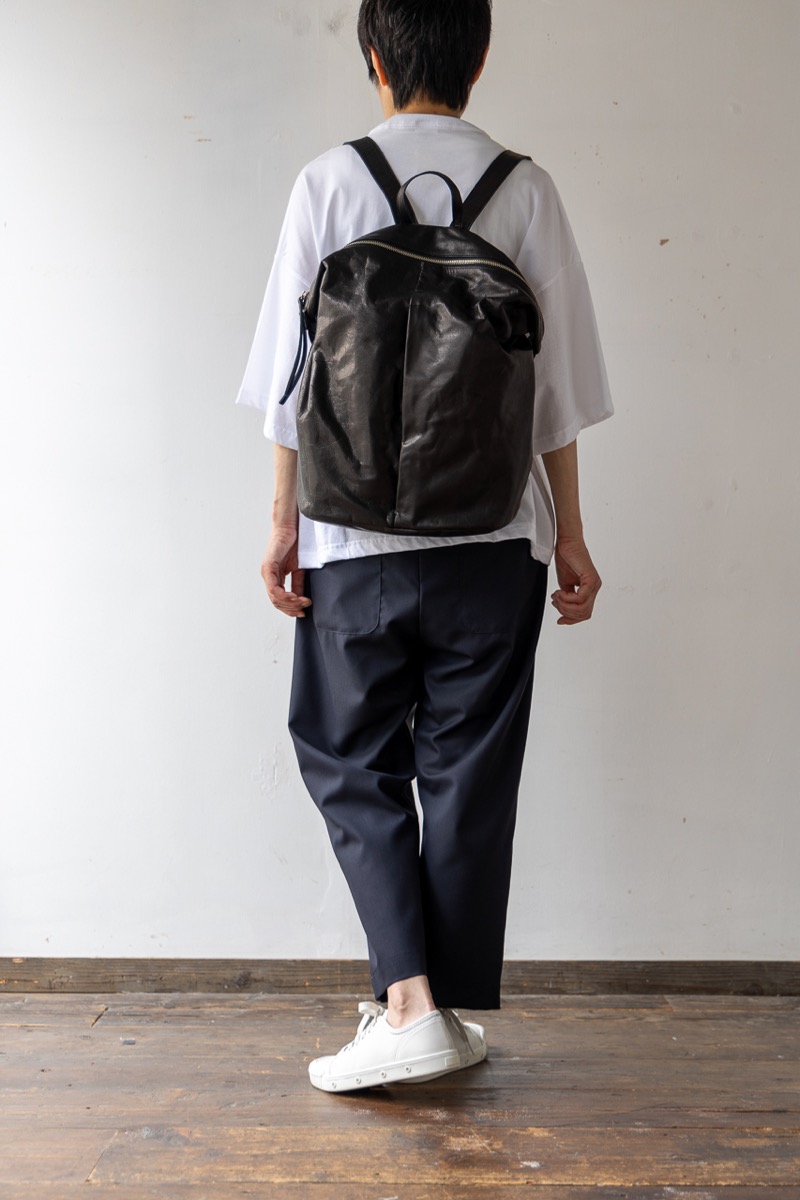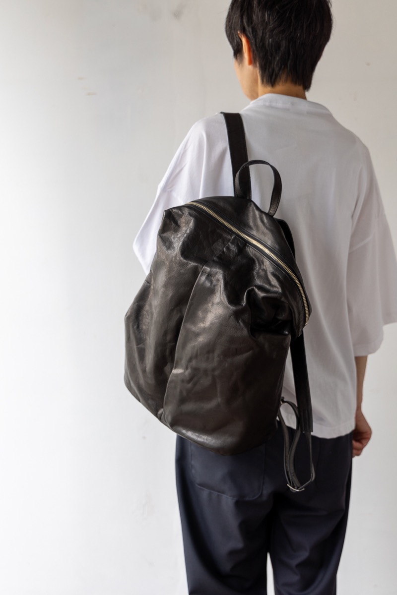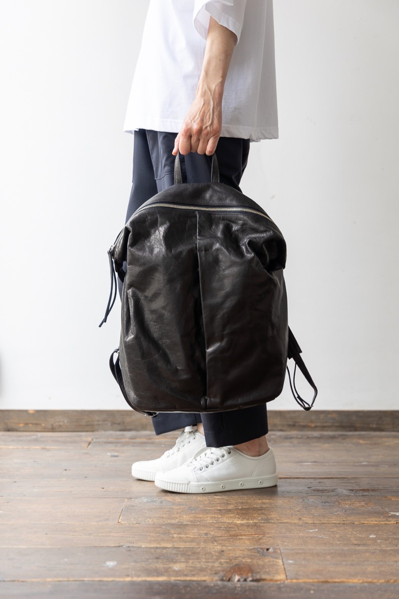 素材 牛革 カラー ブラック サイズ 高さ 39cm 横 29cm 幅(一番広い部分:真ん中) 14.5cm *個体差あります。サイズの多少の誤差はご了承くださいませ。 日本製 *継続商品ですので、一部前回と同じ写真を使用しています。 大きめサイズがカッコいいレザーリュック。再入荷しました。 マチはそれほどボリュームががないので、 思いのほかスッキリ持てます。 定番色のブラックは、幅広いシーンでお使いいただけます。 身長160センチ 洗い加工を施した牛革を使っているので柔らかく、 雰囲気のあるシワ感がカジュアルにも持てるles basiques (レ・バジック)のシリーズ。 ※天然皮革を使用し加工を施した商品です。シワや質感には個体差がございます。 天然素材の風合いと味わいをお楽しみくださいませ。 便利な持ち手付き。 正面の真ん中にファースナー付きポケット。ハンカチやパスケースなど薄いものが入ります。 背中の面もファスナー付きポケットがあります。 深さが約20センチありますので、お財布も入ります。 本体のファスナーを開けると、内側にもファスナー付きの内ポケットと小さめのポケットがあります。 肩の長さ調整可能。 幅は一番広い部分(真ん中で)おおよそ 14.5cm ※パソコンのモニター環境により、商品の色味が実物と異なって見える場合がございます。 予めご了承ください。