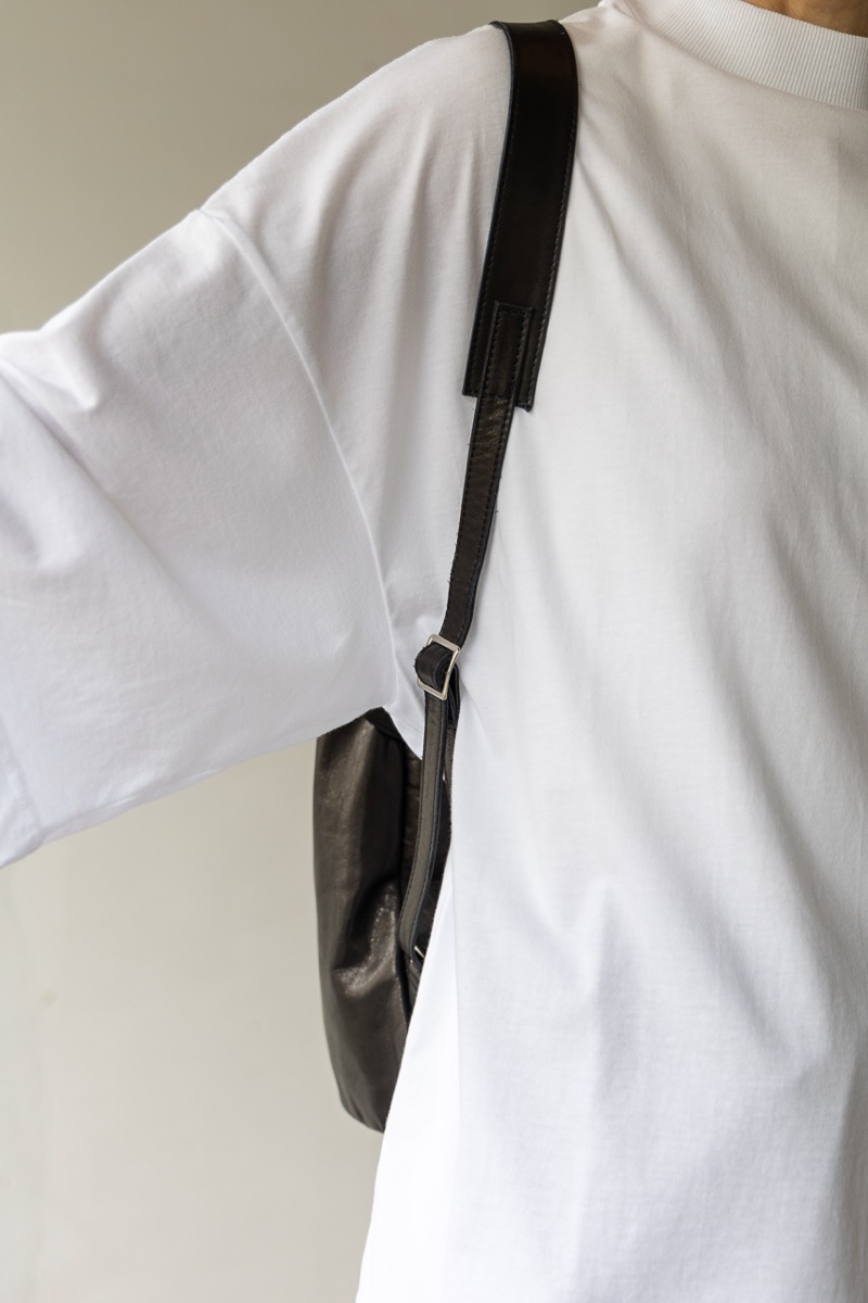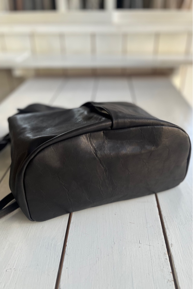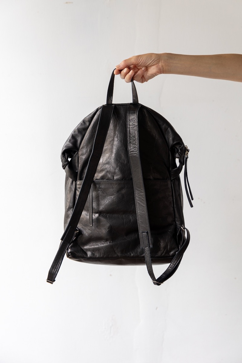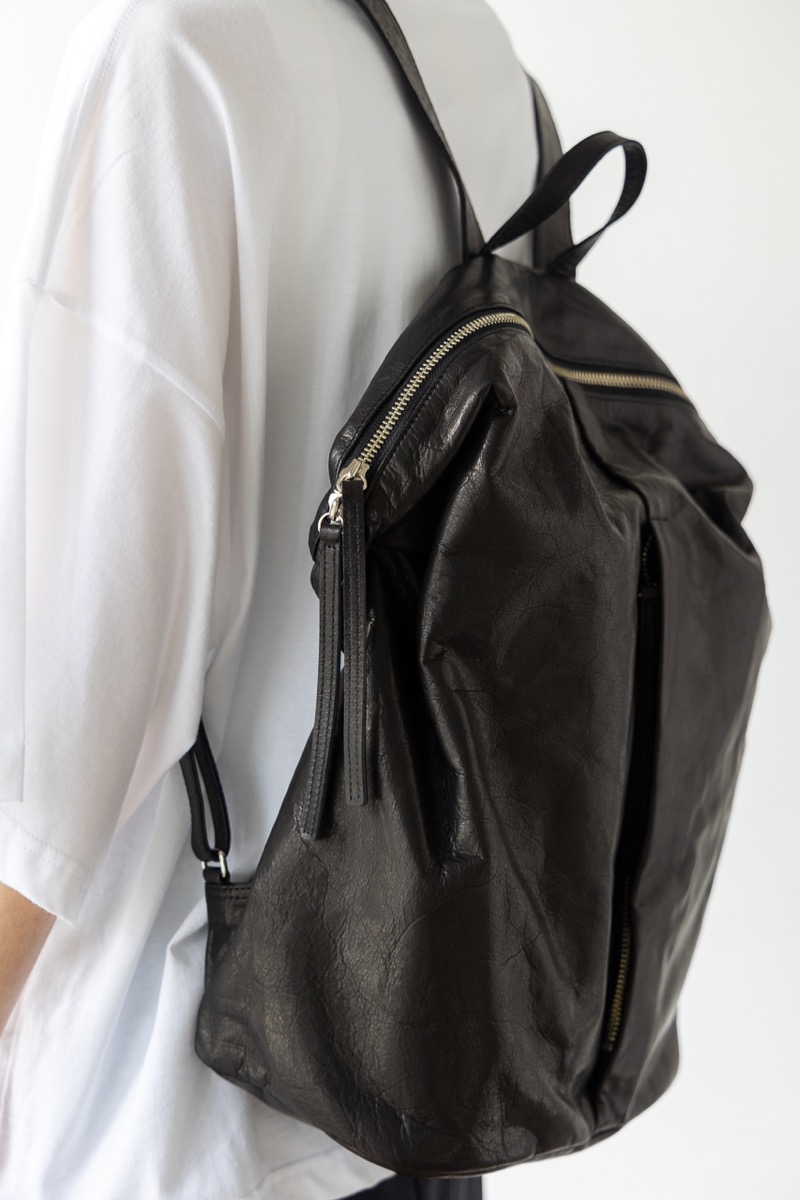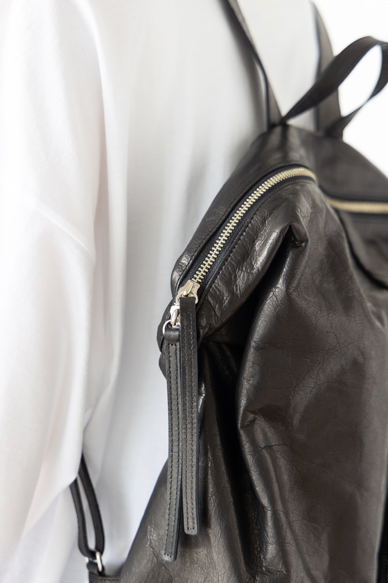 素材 牛革 カラー ブラック サイズ 高さ 39cm 横 29cm 幅(一番広い部分:真ん中) 14.5cm *個体差あります。サイズの多少の誤差はご了承くださいませ。 日本製 *継続商品ですので、一部前回と同じ写真を使用しています。 大きめサイズがカッコいいレザーリュック。再入荷しました。 マチはそれほどボリュームががないので、 思いのほかスッキリ持てます。 定番色のブラックは、幅広いシーンでお使いいただけます。 身長160センチ 洗い加工を施した牛革を使っているので柔らかく、 雰囲気のあるシワ感がカジュアルにも持てるles basiques (レ・バジック)のシリーズ。 ※天然皮革を使用し加工を施した商品です。シワや質感には個体差がございます。 天然素材の風合いと味わいをお楽しみくださいませ。 便利な持ち手付き。 正面の真ん中にファースナー付きポケット。ハンカチやパスケースなど薄いものが入ります。 背中の面もファスナー付きポケットがあります。 深さが約20センチありますので、お財布も入ります。 本体のファスナーを開けると、内側にもファスナー付きの内ポケットと小さめのポケットがあります。 肩の長さ調整可能。 幅は一番広い部分(真ん中で)おおよそ 14.5cm ※パソコンのモニター環境により、商品の色味が実物と異なって見える場合がございます。 予めご了承ください。
