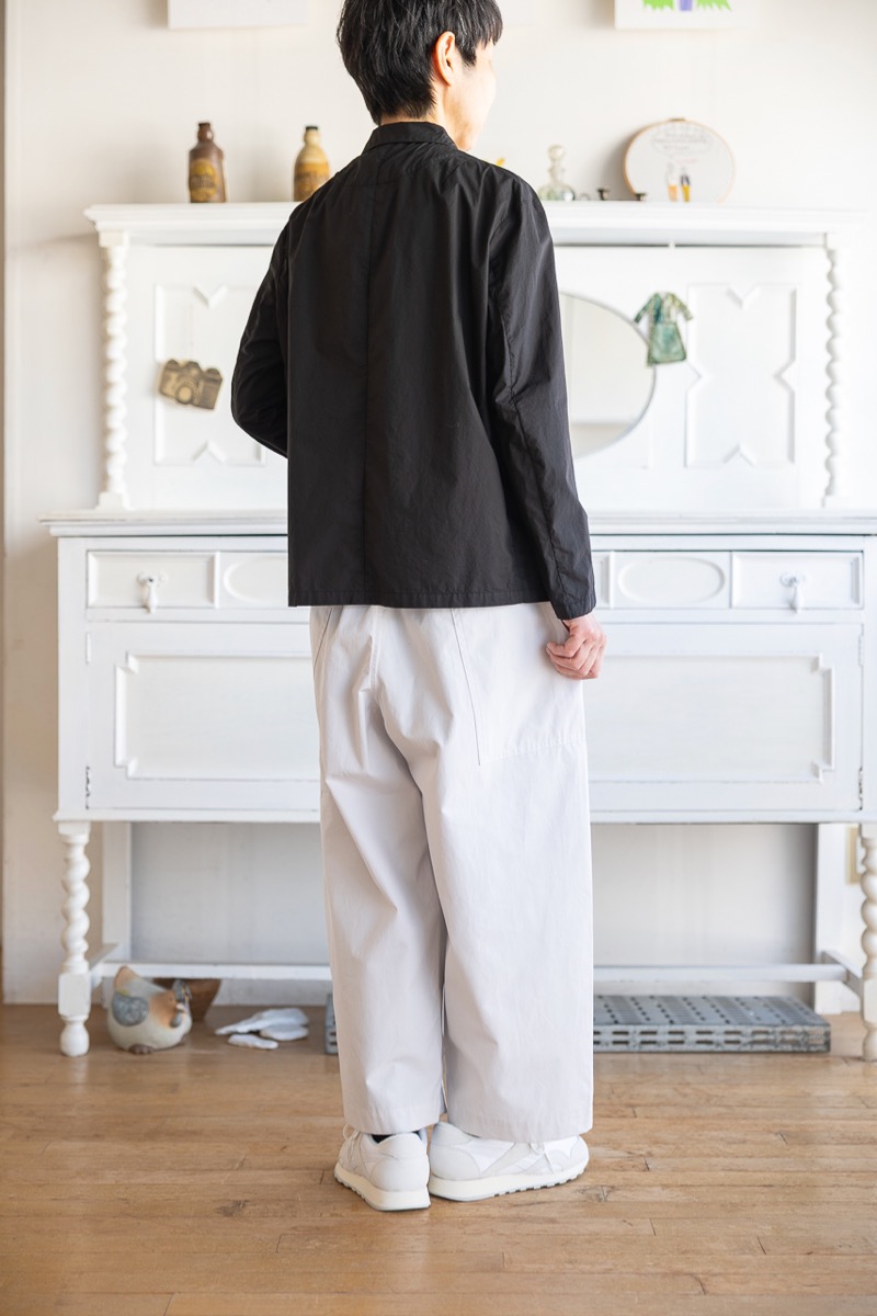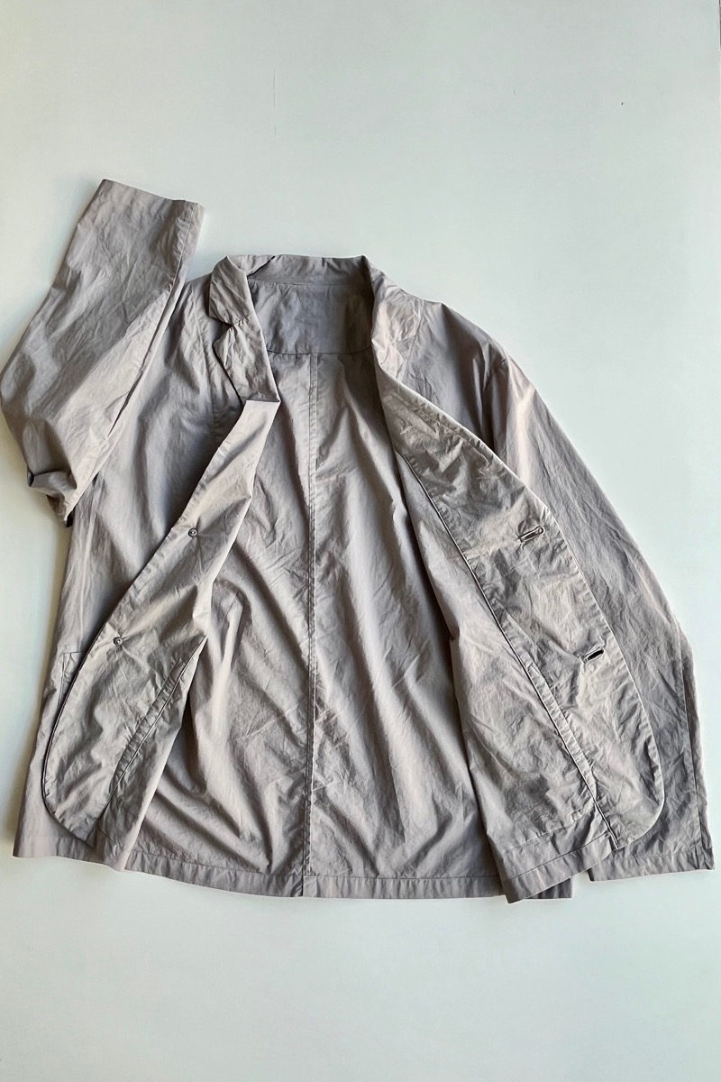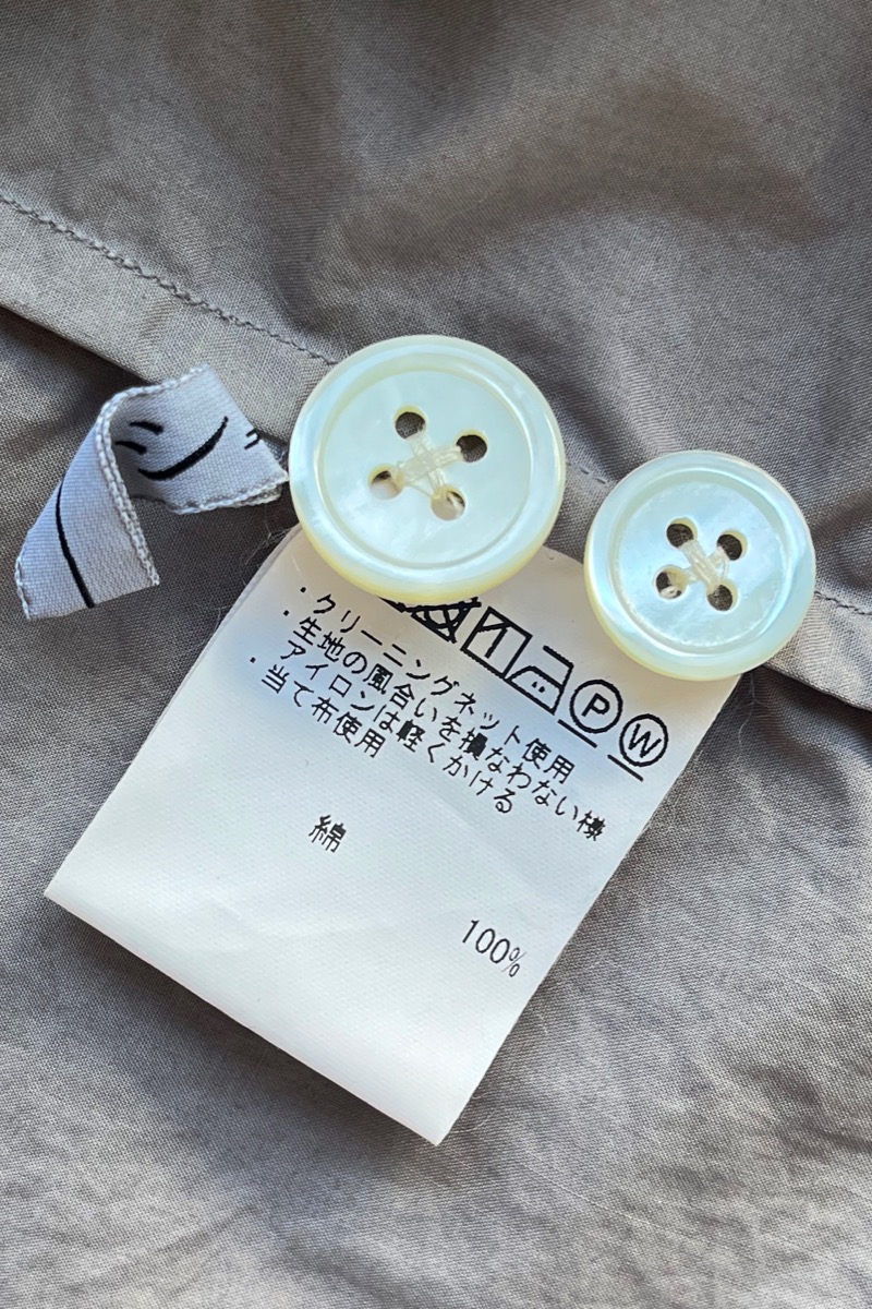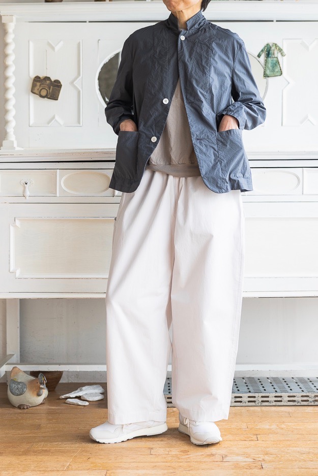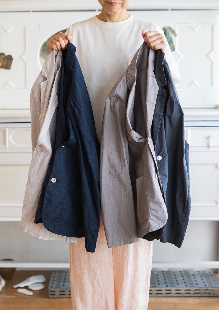 素材 綿100%(裏地なし) カラー グレイッシュグリーン(グリーンがかった濃いグレー) ブラウングレー (グレーベージュ) ブラック サイズ 2(ワンサイズ) 肩幅 43.5 身幅 52 着丈 62.5 袖丈56 袖口幅 12 (cm) *サイズの多少の誤差はご了承くださいませ。 ゴーシュのジャケットは、ジャケットだけどカジュアル。 シャツ感覚で羽織れる一枚仕立ての、とても軽いジャケット。 サイズはワンサイズ。 小さすぎず、大きすぎない、Tシャツの上にラフに気軽に羽織るのにちょうど良いくらいの、 すっきりしたサイズ感と、飽きのこないシンプルなデザインです。 昨年と生地はパッと見は似ていますが、(参考までに昨年のタイプはこちら→*) 今季はとても薄地で目の詰まったほんのりハリのあるタイプライター。 表面がつるっとしていて綺麗めな雰囲気もあります。 *洗い加工が施してありますので、全体に洗いざらしの強めのシワ感があり、ラフな雰囲気を出しています。 薄地ですが、透け感は気になりません。 向かって左がグレイッシュグリーン(グリーンがかった濃いグレー) 右がブラウングレー (グレーベージュ) 身長160センチ ブラック着用 向かって左がグレイッシュグリーン(グリーンがかった濃いグレー) 一番上のボタンを留めると、また違った雰囲気に。 キュッと詰まったスタンドカラーのようになります。 上より ブラック グレイッシュグリーン(グリーンがかった濃いグレー) ブラウングレー (グレーベージュ) ブラック グレイッシュグリーン(グリーンがかった濃いグレー) ブラウングレー (グレーベージュ) 手洗い可 向かって右がタイプライタージャケット。 左が素材違いのヘンプジャケット。カタチは同じでも素材が違うと雰囲気も変わりますね。 ※パソコンのモニター環境により、商品の色味が実物と異なって見える場合がございます。 予めご了承ください。